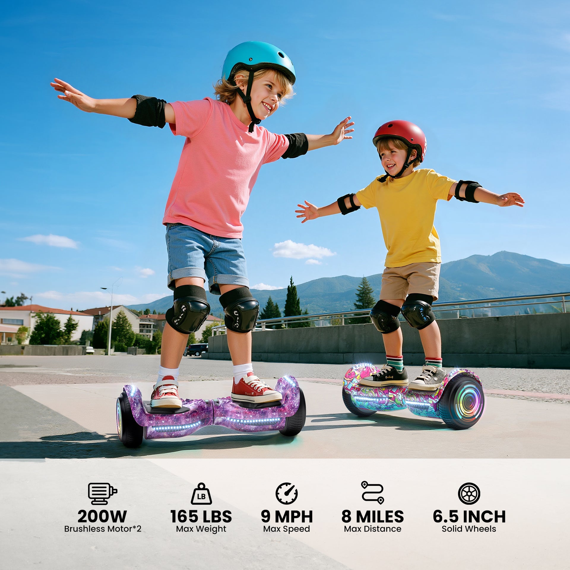 • 【Learn to Ride in 5 Minutes】Full of technology and easy to learn for beginners and amateurs, design emergency safety protection measures to limit the speed of self balancing scooter hover board to ensure the safety of kids while them enjoy the fun of driving.