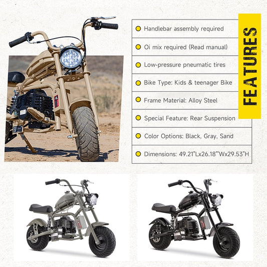 Aoemoe 49cc Gas Mini Chopper for Teens & Adults, Dirt Bike with Headlight, Rear Shock, Disc Brakes, 20MPH, Sand