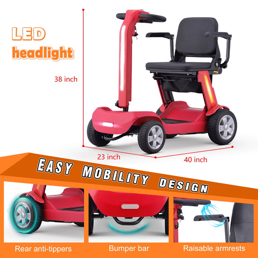 4 Wheels Mobility Scooter for Adults & Senior, Foldable Lightweight Powered Device for Travel, with LED Strip Light, Storage Bag, Charger Included, No Assemble Required (Red)