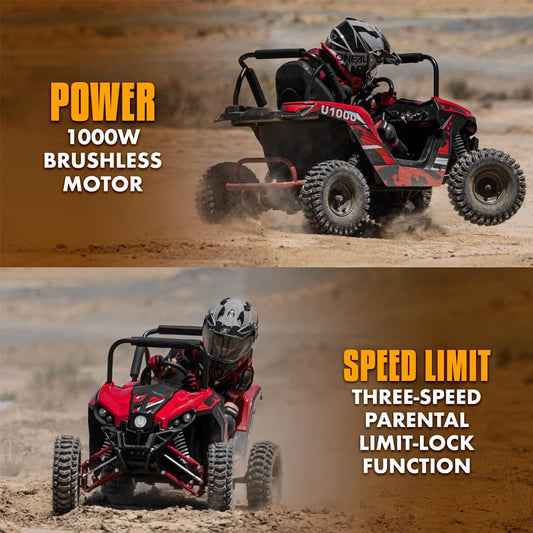 Aoemoe UTV Ride on Car (Large),Shock Absorber, 48V Electric Vehicles with Disk Brake, Gear Switch, Steel Frame, Off-Road Tire, Flexible Seat Belt and Seat, Three-Speed Parental Limit-Lock Function (Red)