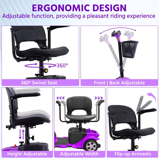 Aoemoe 4 Wheel Mobility Scooter for Seniors, Foldable Powered Mobile Wheelchair for Adult 300lbs, Purple