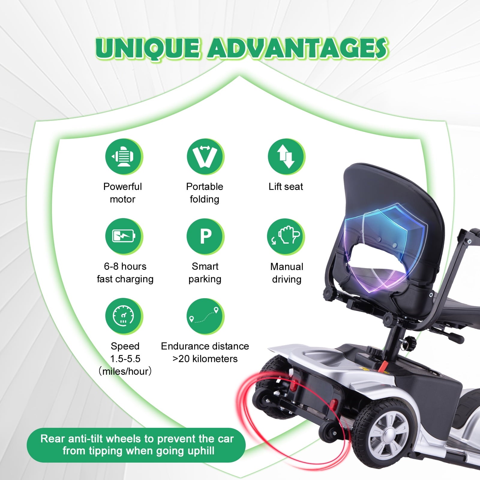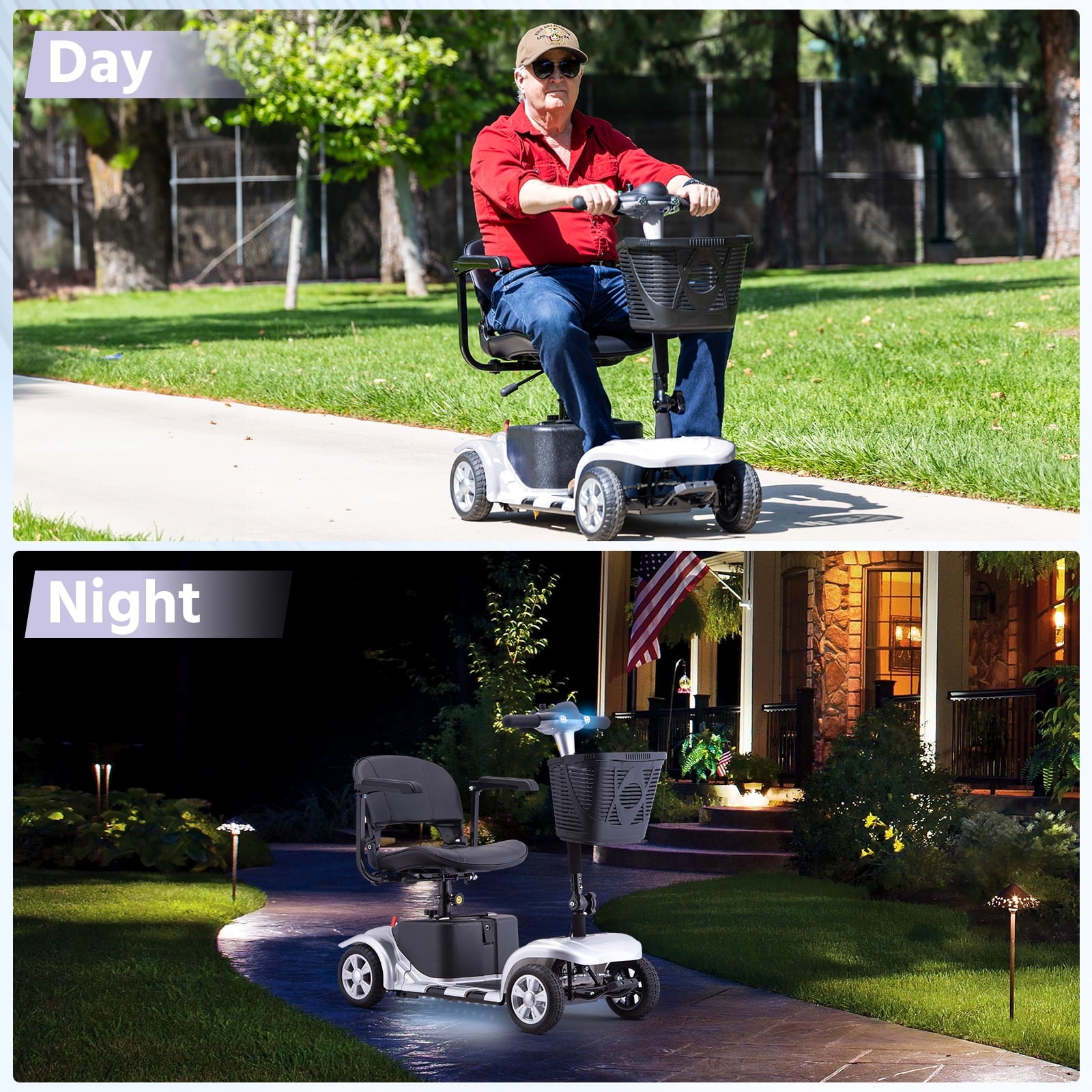 Aoemoe 4 Wheels Mobility Scooter for Adults, Senior Electric Powered Chargeable Device for Travel, Lightweight and Portable, with LED Headlights and Basket, Charger Included (Silver)