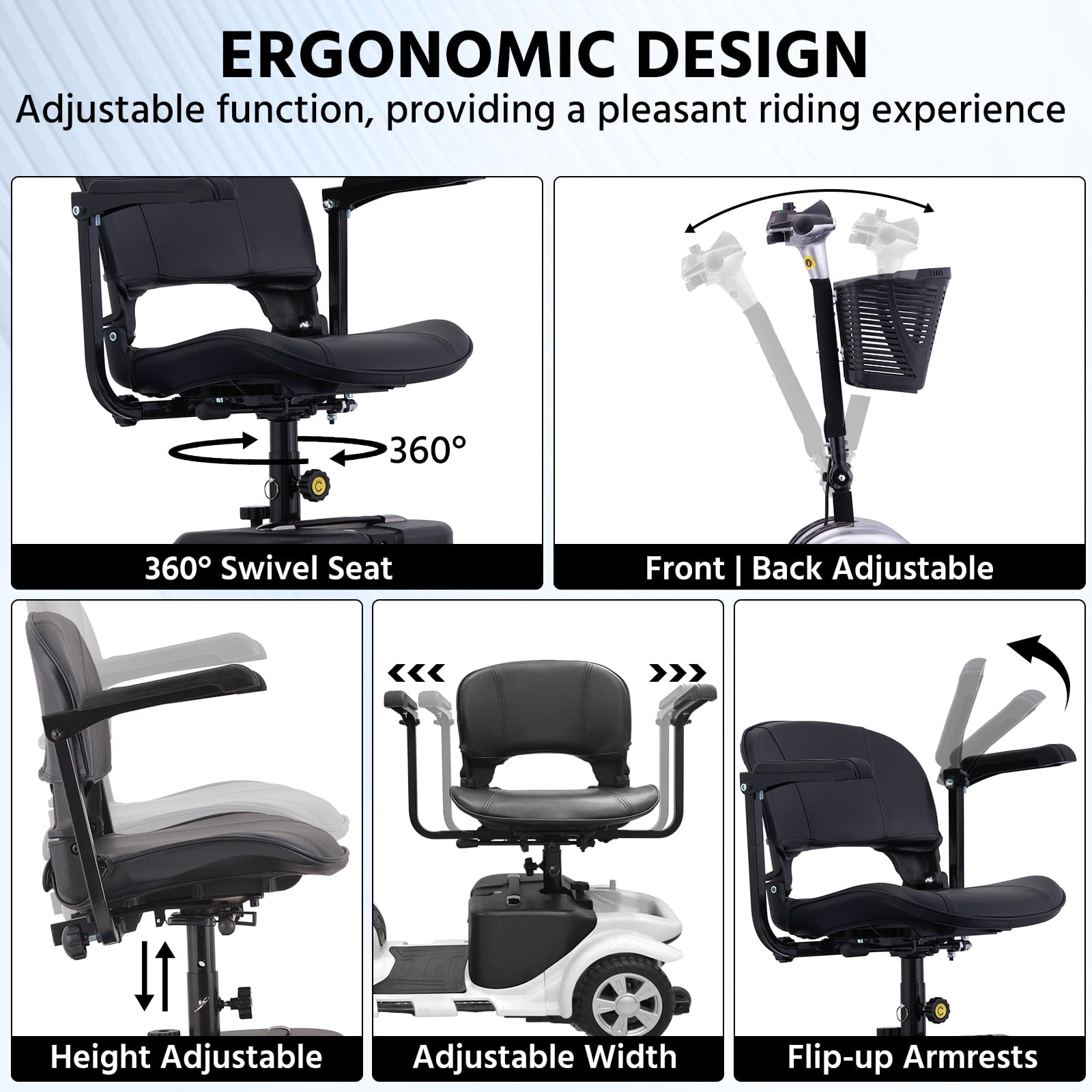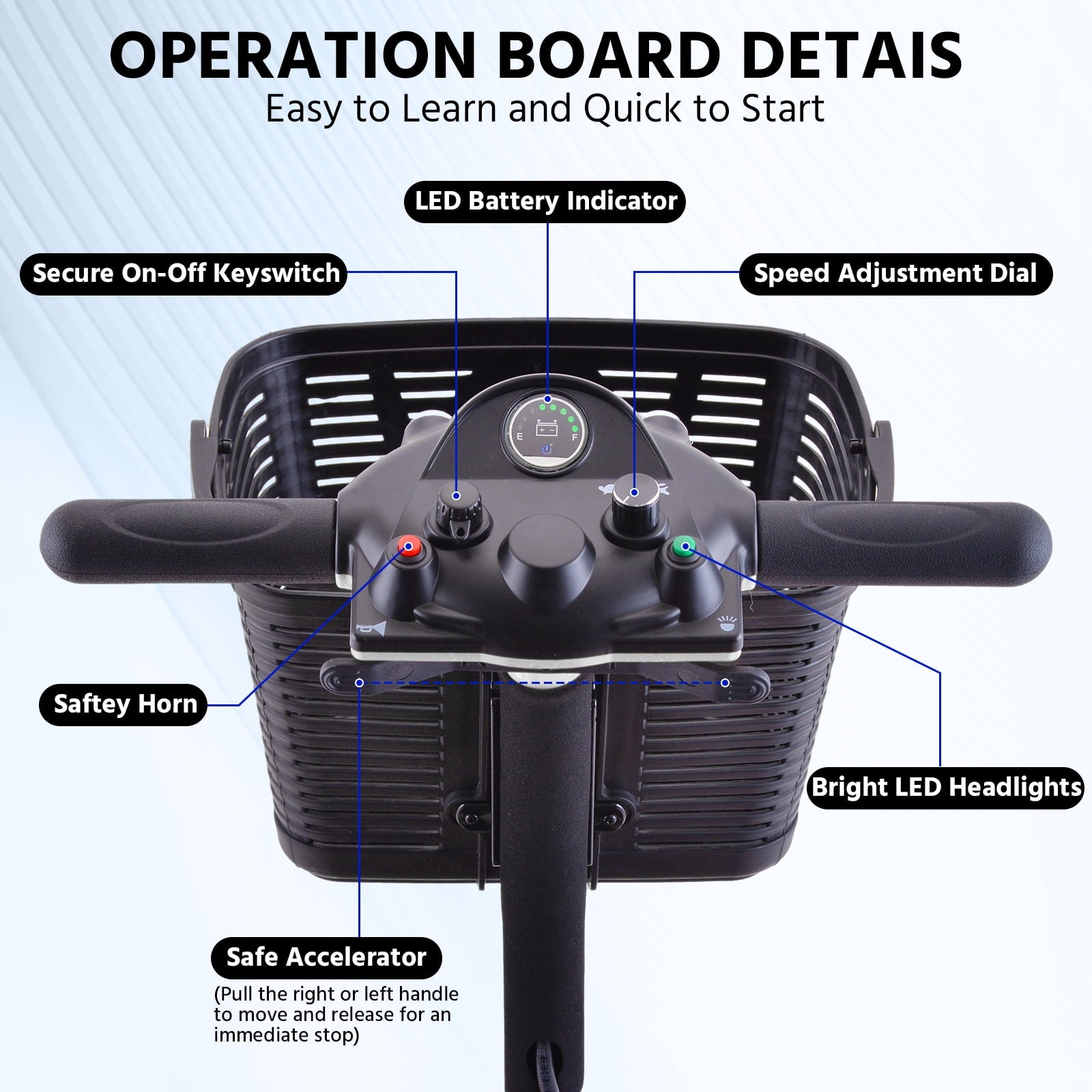 Mobility Scooter:It is equipped with 24-volt 12AH removable battery, with a standard driving distance of up to 15 miles per charge and a maximum speed of 4.5 MPH. This scooter is a great choice for easy travel when you want to running errands, go to the supermarket to buy groceries, or go to the park with friends