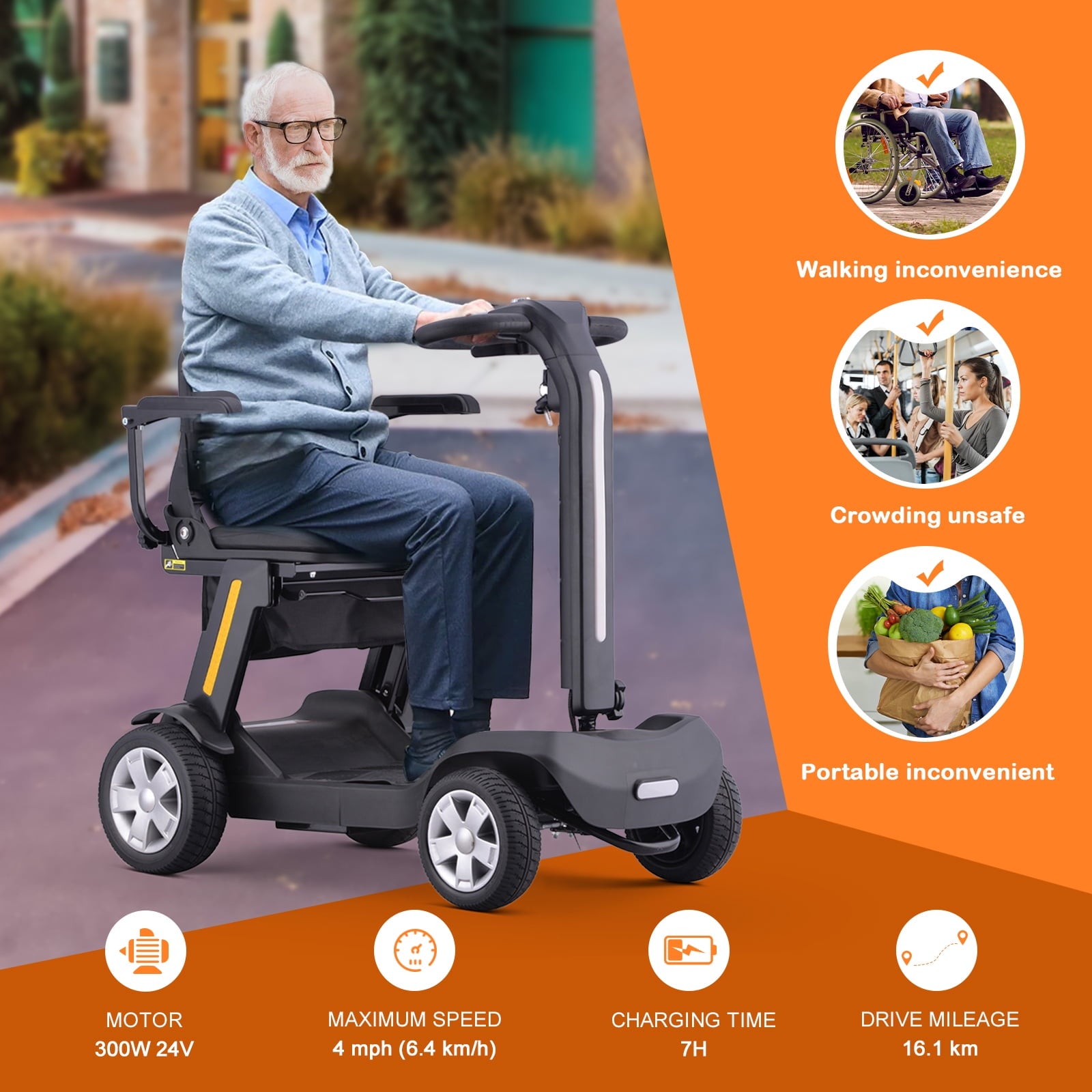 4 Wheels Mobility Scooter for Adults & Senior, Foldable Lightweight Powered Device for Travel, with LED Strip Light, Storage Bag, Charger Included, No Assemble Required (Black)