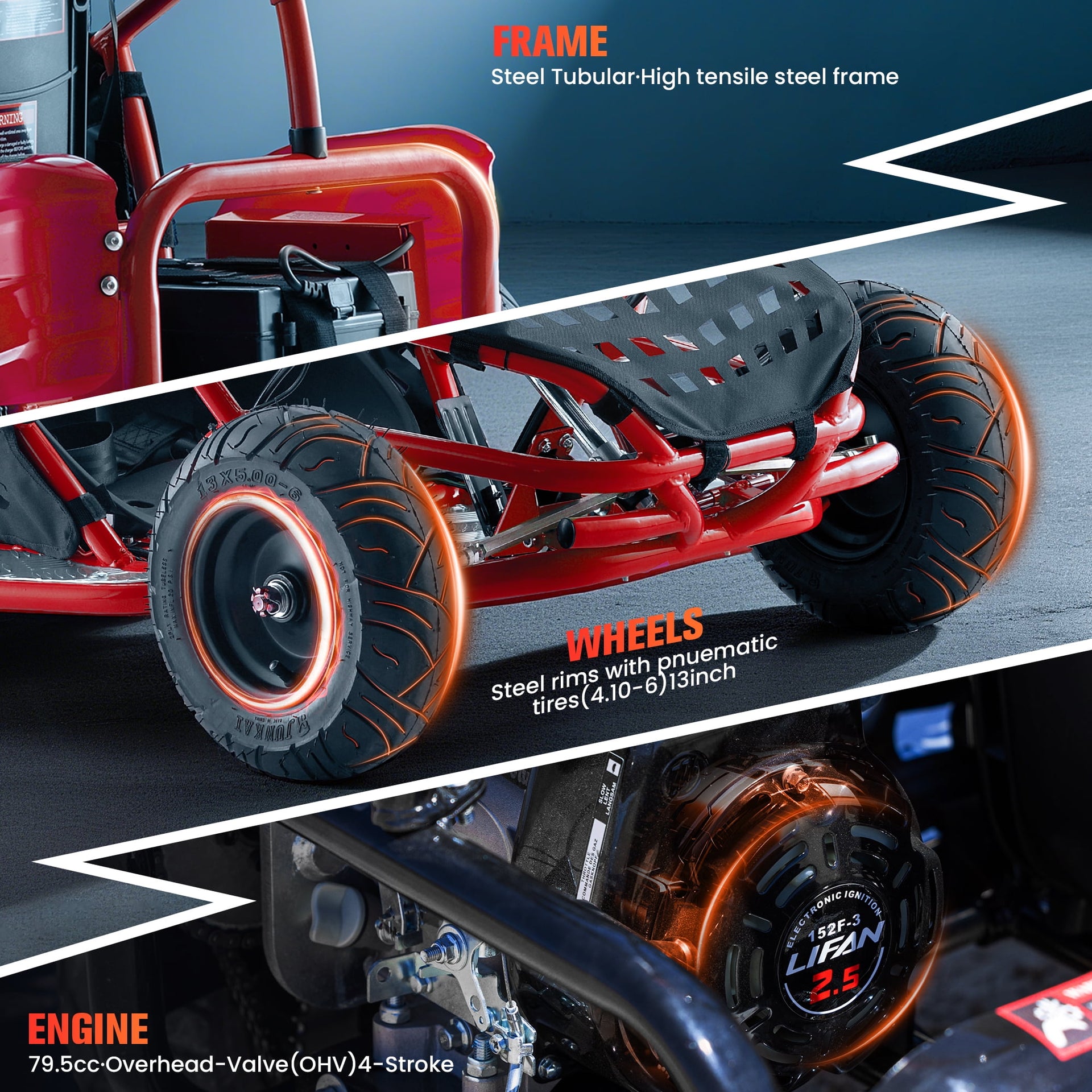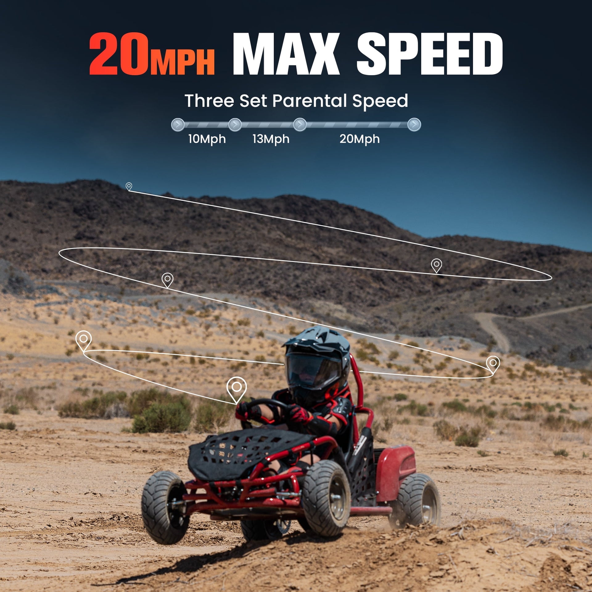 • 1000W Brushless Boost – 48V system launches kart to 20 mph with whisper-quiet, maintenance-free performance.