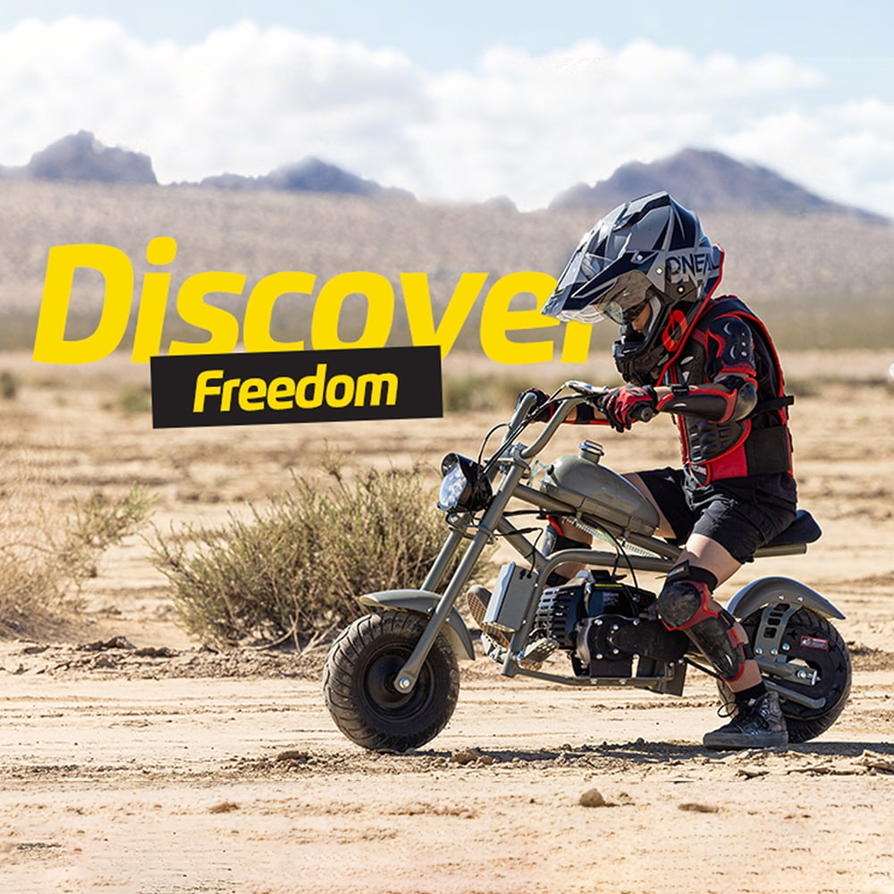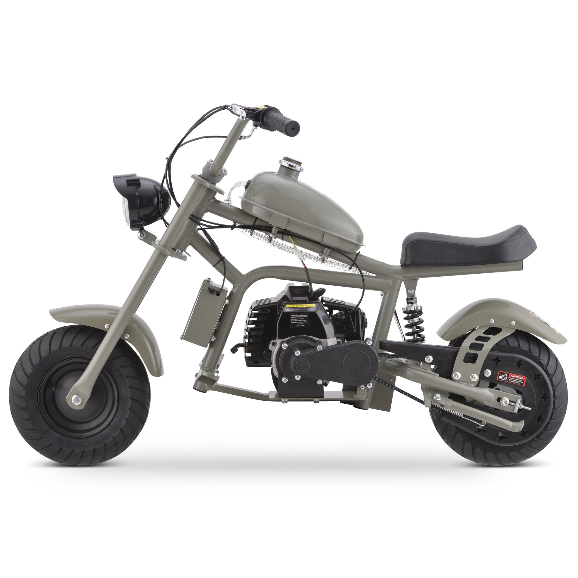 • 49 cc 2-Stroke Power – Twist-grip throttle launches riders up to 18 mph on dirt, grass or pavement.