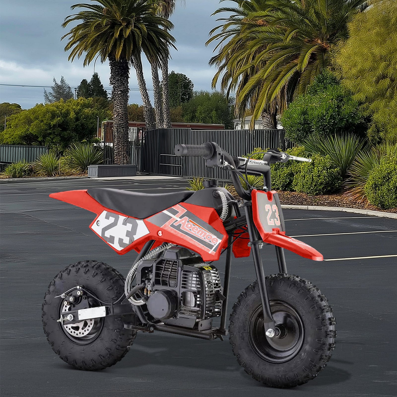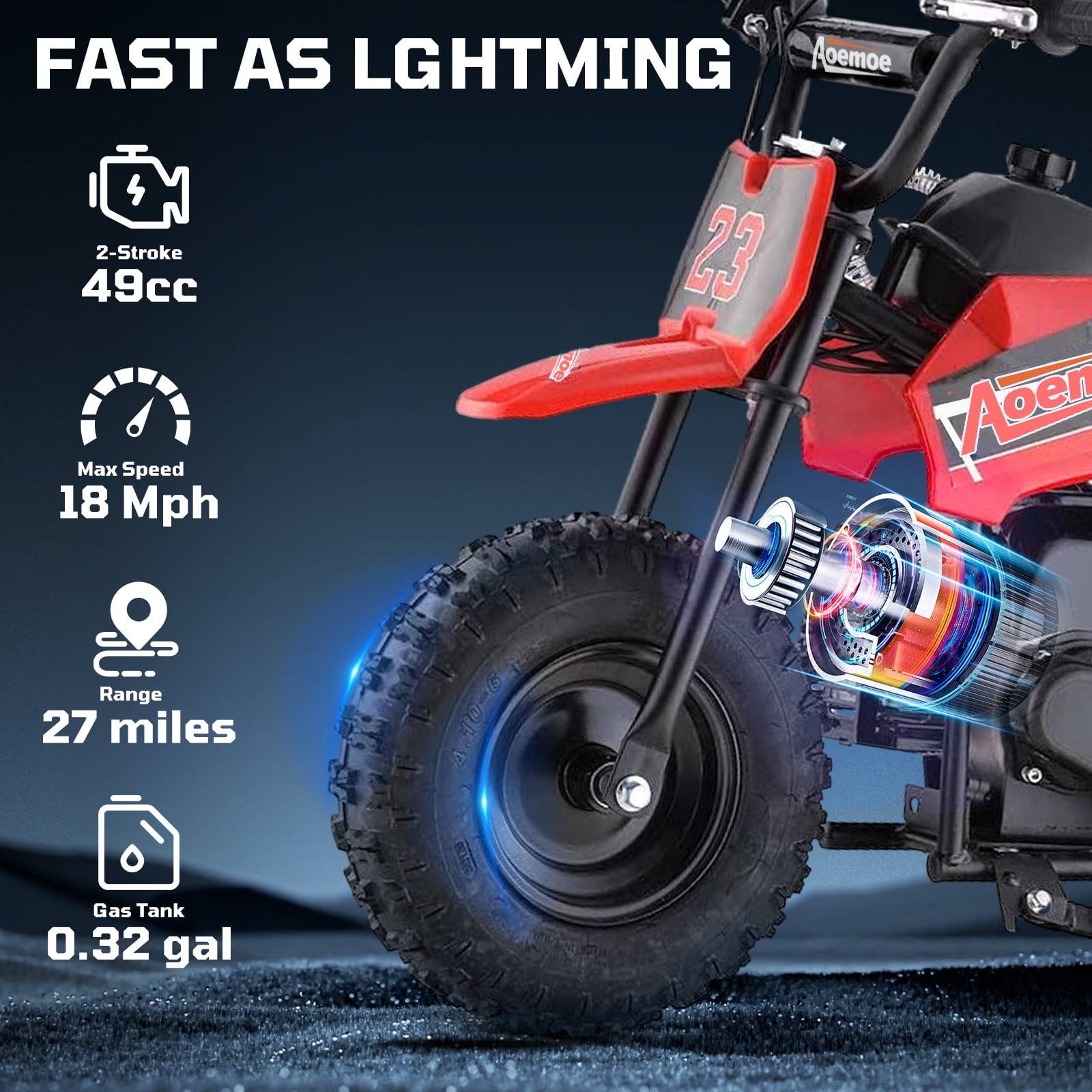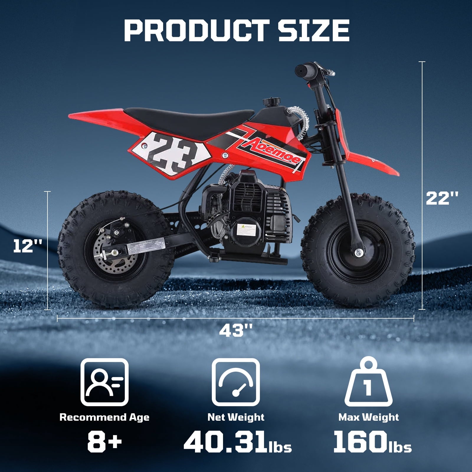 Aoemoe 49cc Kids Dirt Bike Gas Powered, Mini Off-Road Motorcycle with Suspension & Disc Brakes, 18 Mph, 160 Lbs Capacity, Red