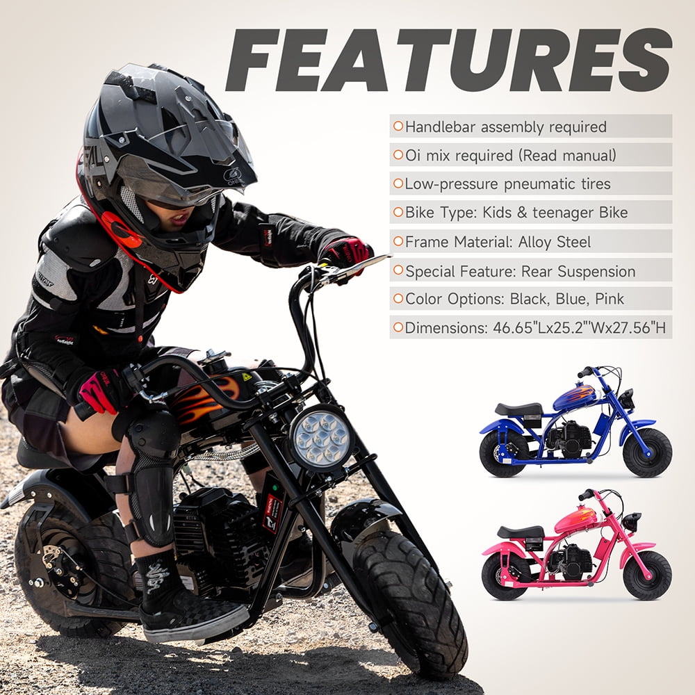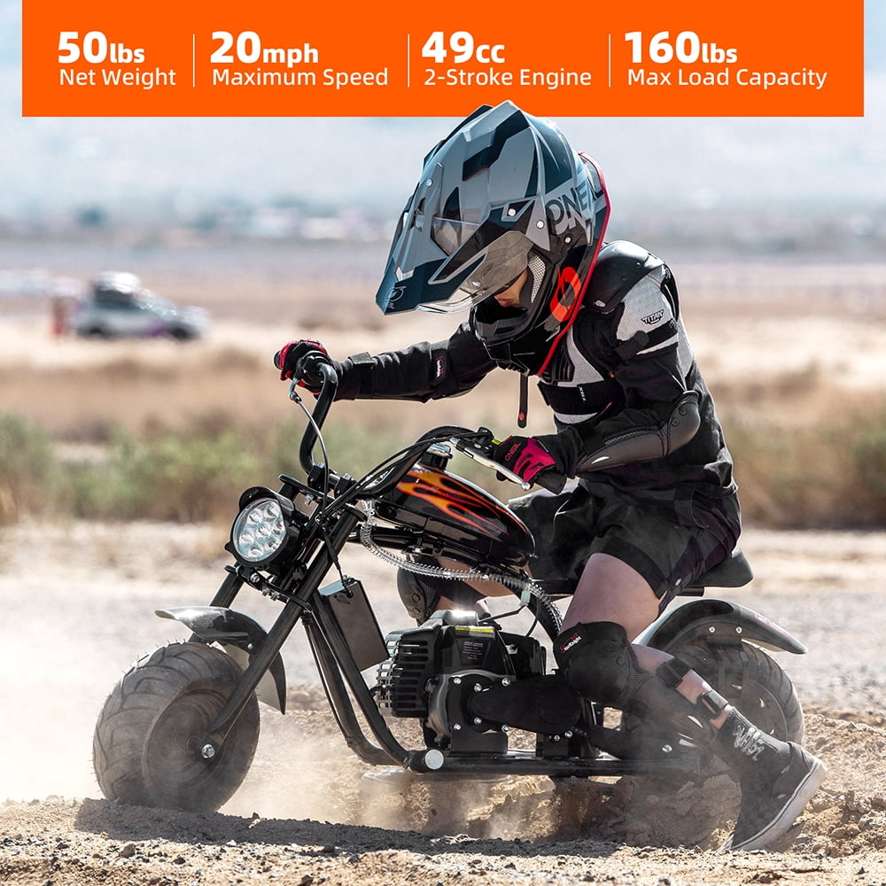 • 49 cc 2-STROKE FUN – Chain-driven engine with pull-start fires up fast and hits a max speed of 18 mph for safe, exciting off-road rides.