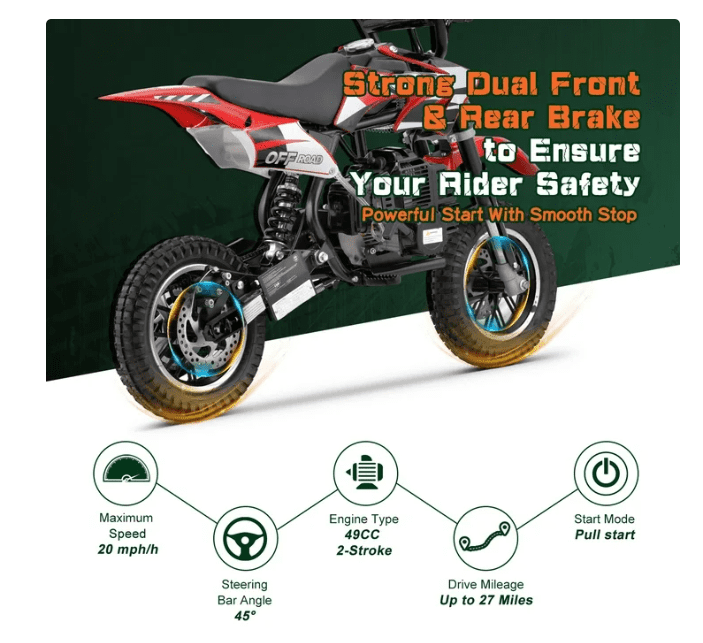 49 cc gas mini chopper for teens & adults hits 18 mph, covers 27 miles per tank. Rear disc brake, shock absorber, reinforced metal frame—easy assembly, tools included.