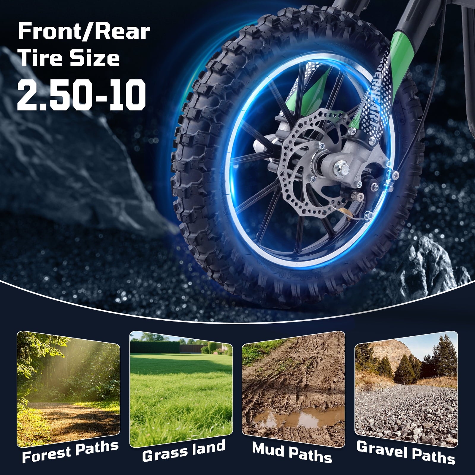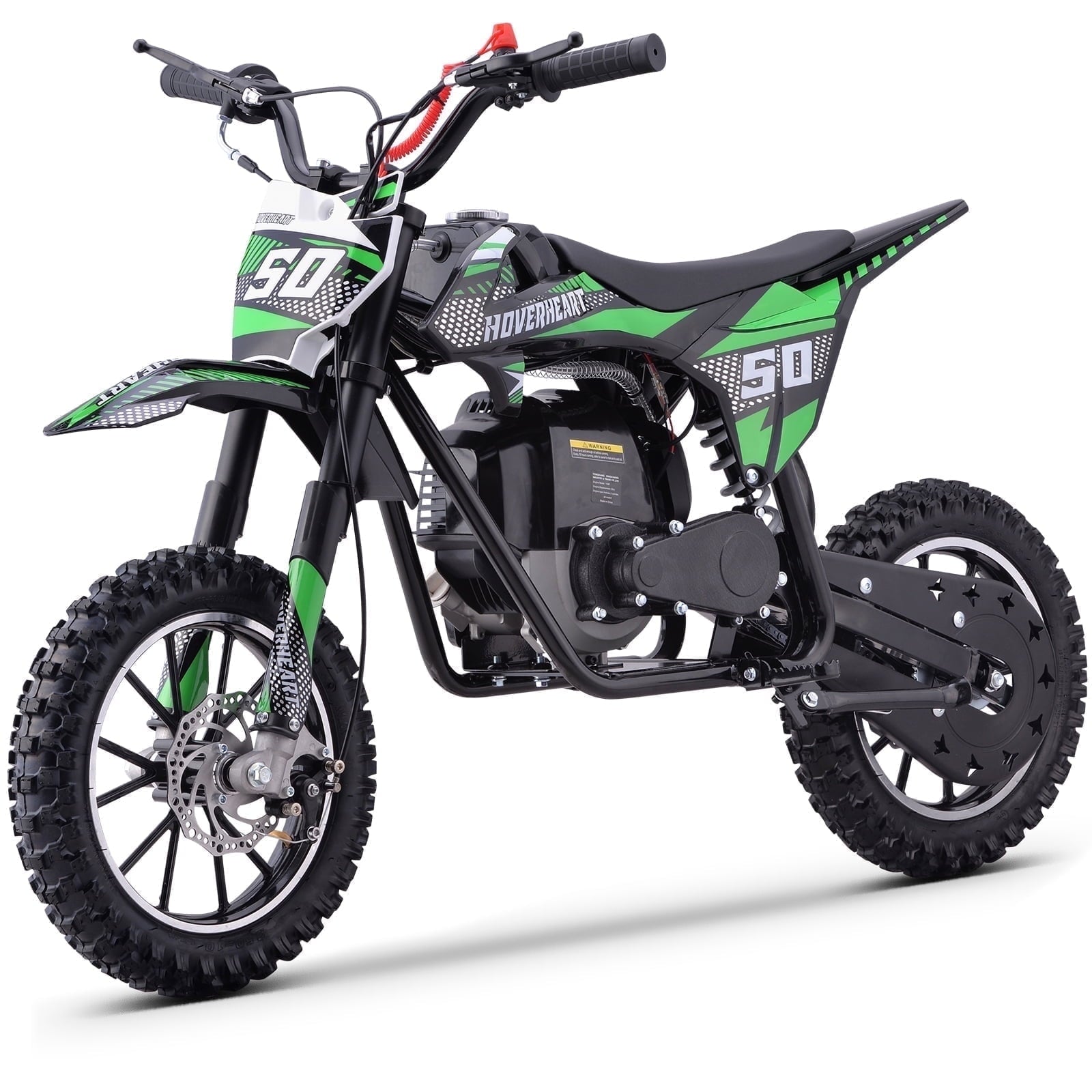 Key Information: Dirt bikes dimensions 51.18"L x 23.23"W x 31.10"H, Net weight 55lb, NO OIL MIX REQUIRED( gasoline direct ), Pull Start, Handle throttle, Pressure air tires.