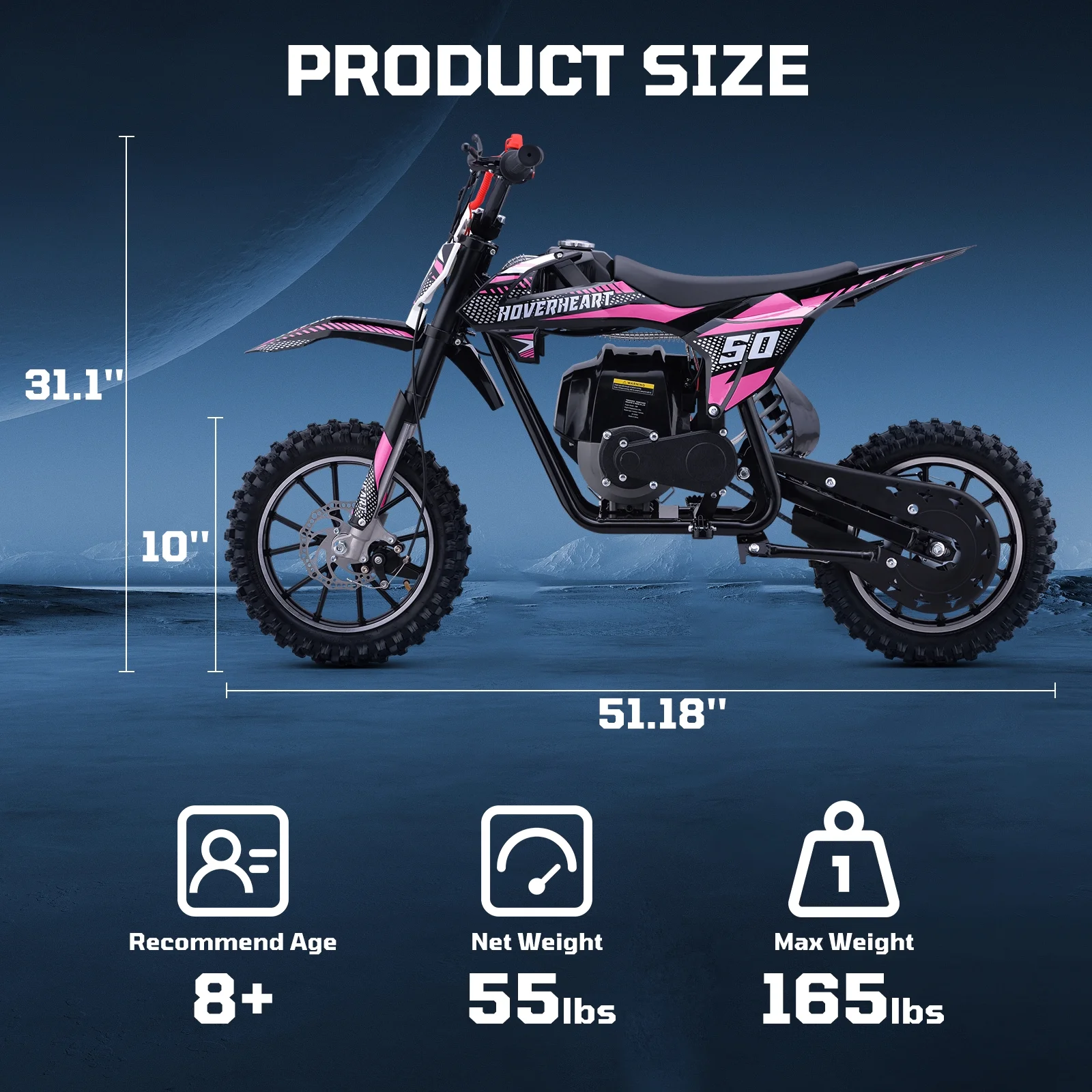Key Information: Dirt bikes dimensions 51.18"L x 23.23"W x 31.10"H, Net weight 55lb, NO OIL MIX REQUIRED( gasoline direct ), Pull Start, Handle throttle, Pressure air tires.
