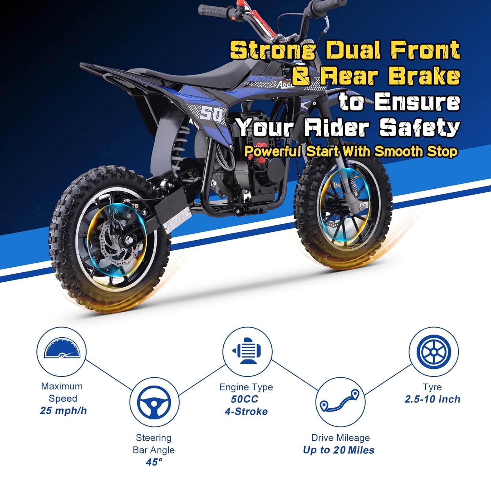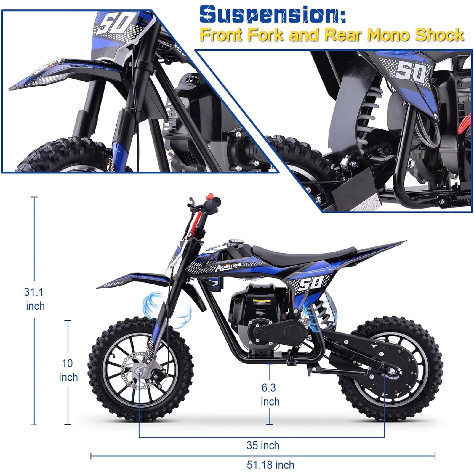 Aoemoe Gas Dirt Bike, 50cc 4-Stroke Gas Powered Kids Off Road Motorcycle (Model-DB4S004) with Off-Road Tire, Suspensions, Disc Brakes, Max Load 165Lbs, Up to 25Mph, NO OIL MIX REQUIRED
