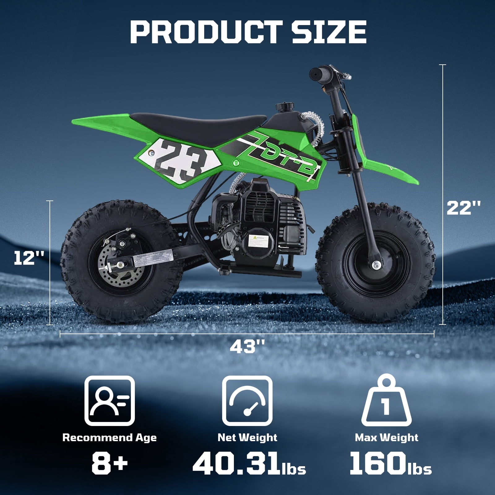 Key information: The dirt bike dimensions 38"L x 22"W x 27"H, Net weight 40.31lb, handle bar accembling required, Oil mix required( Read detail in Manual ), Pull Start, Handle throttle, pressure air tires.