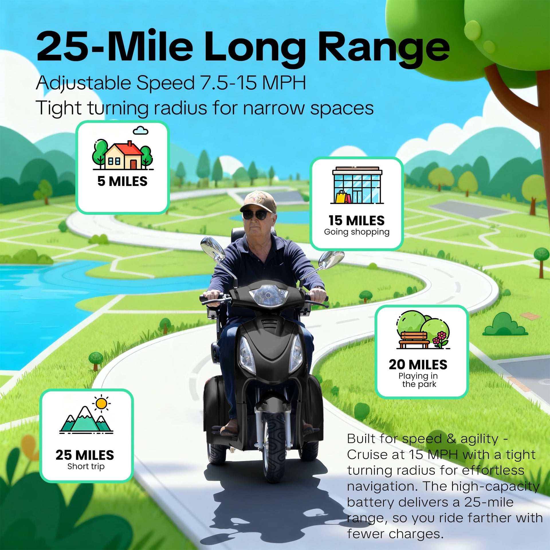 🎁【31-Mile Range & 15 MPH Top Speed: Go Farther, On Your Terms】Experience extended freedom with an impressive 31-mile range on a single charge. As a versatile mobility scooter, it offers adjustable speeds up to 15 MPH, giving you full control to match your pace to any environment—from leisurely strolls to efficient commutes.
