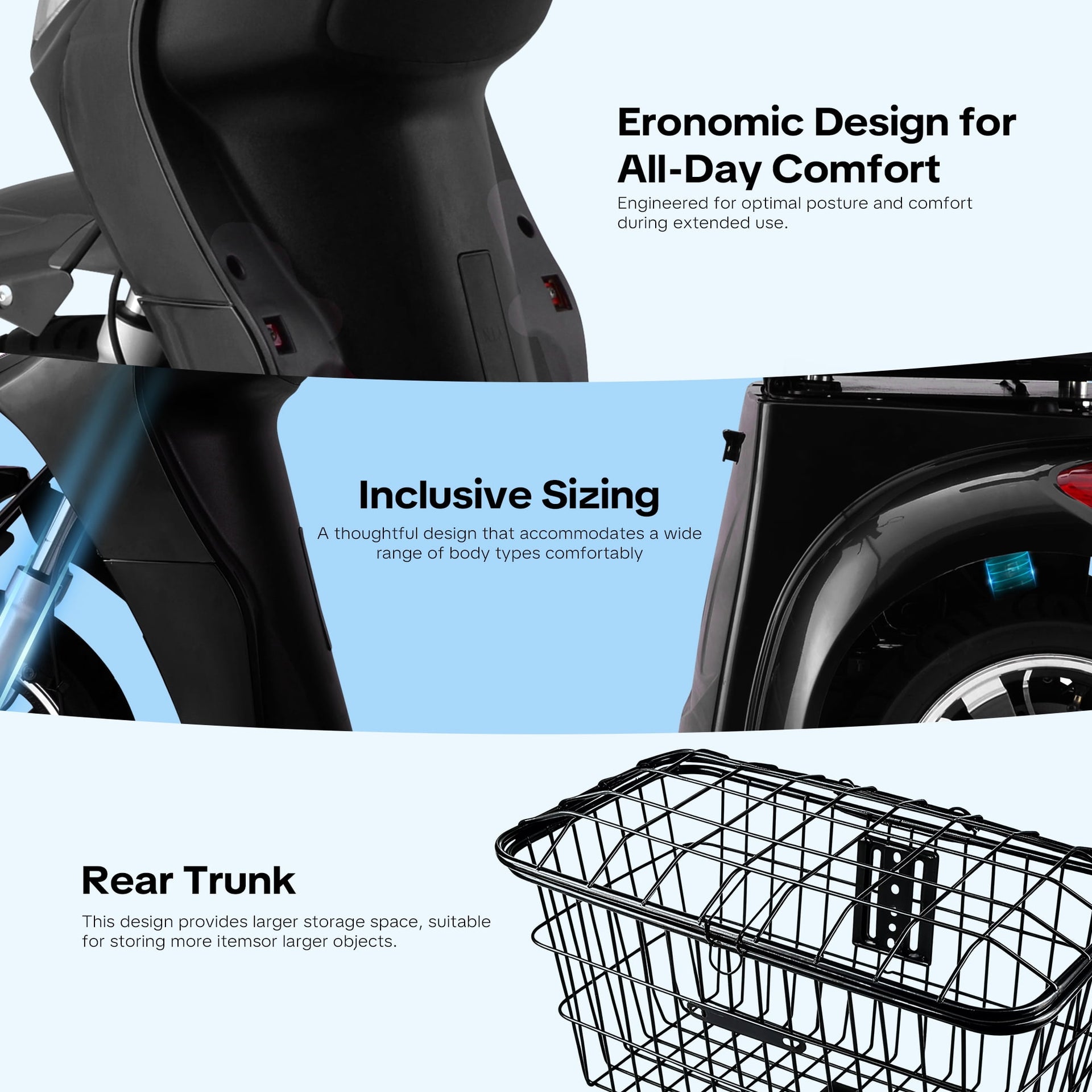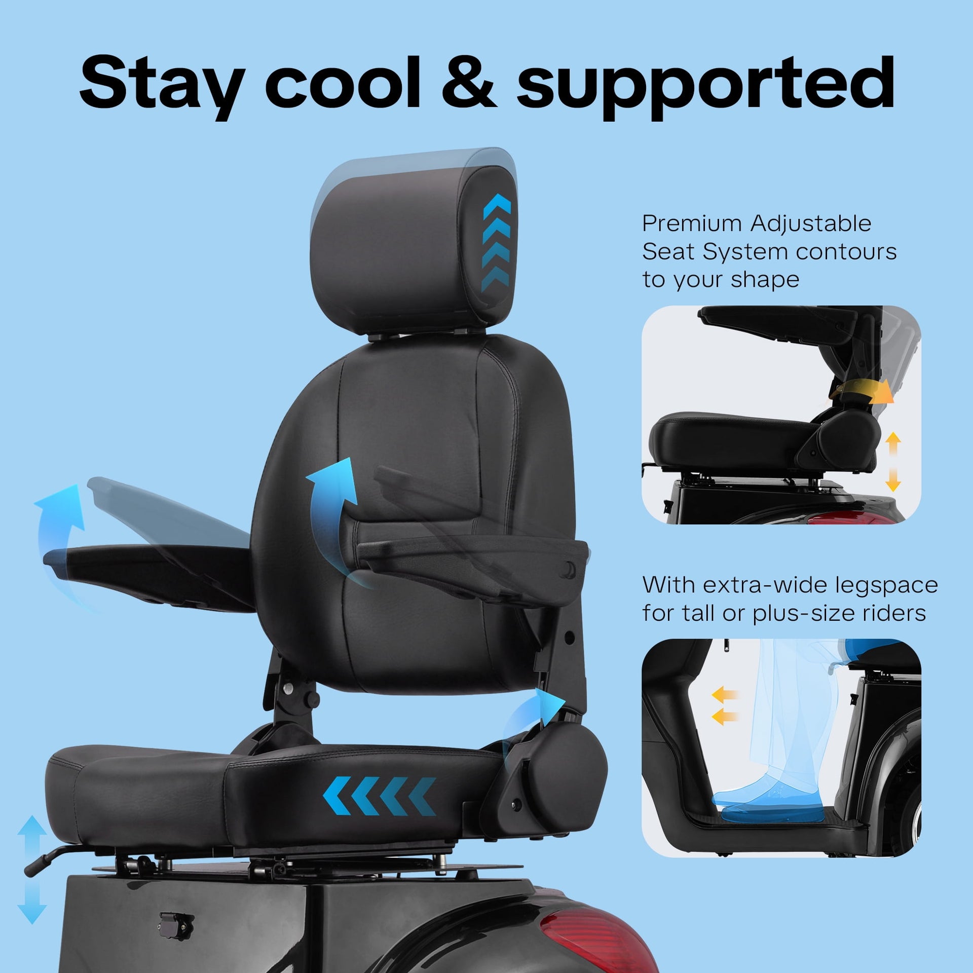 🎁【Premium Comfort & Lockable Storage: Ride Relaxed, Store Securely】Designed for all-day use, this heavy duty mobility scooter includes a plush, adjustable seat, supportive backrest, and armrests. The locking seat reveals a spacious storage compartment, blending superior comfort with practical security for adults on the go.