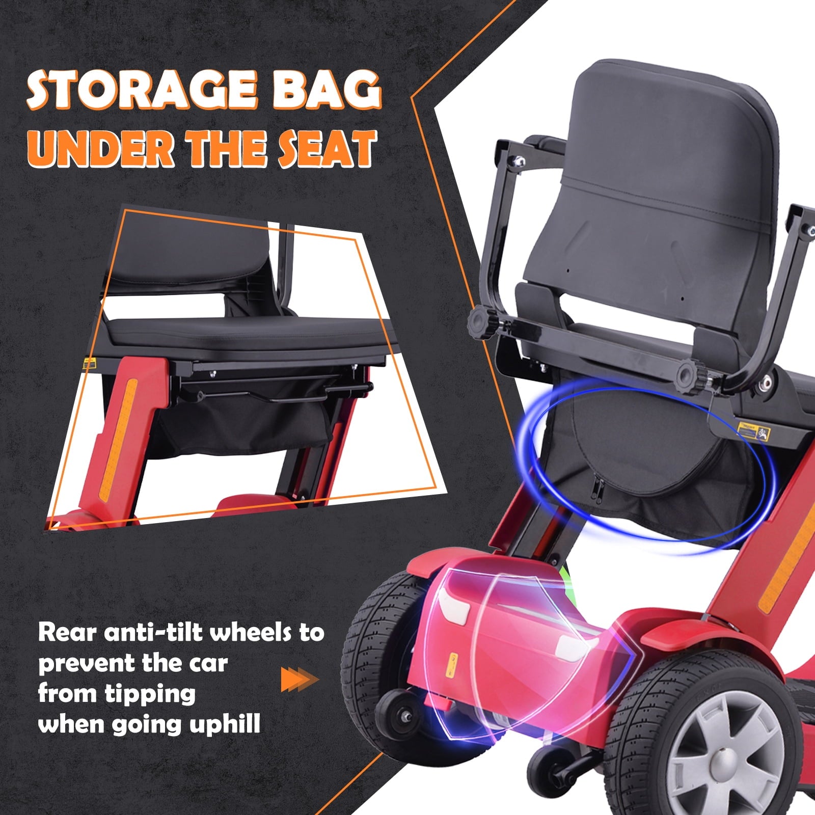 • 【Safety First】The mobility scooter prioritizes safety with automatic speed control on slopes,rollover protection,and rear anti-tilt wheels for stable reversing.The electro-mechanical brake engages instantly when stopping