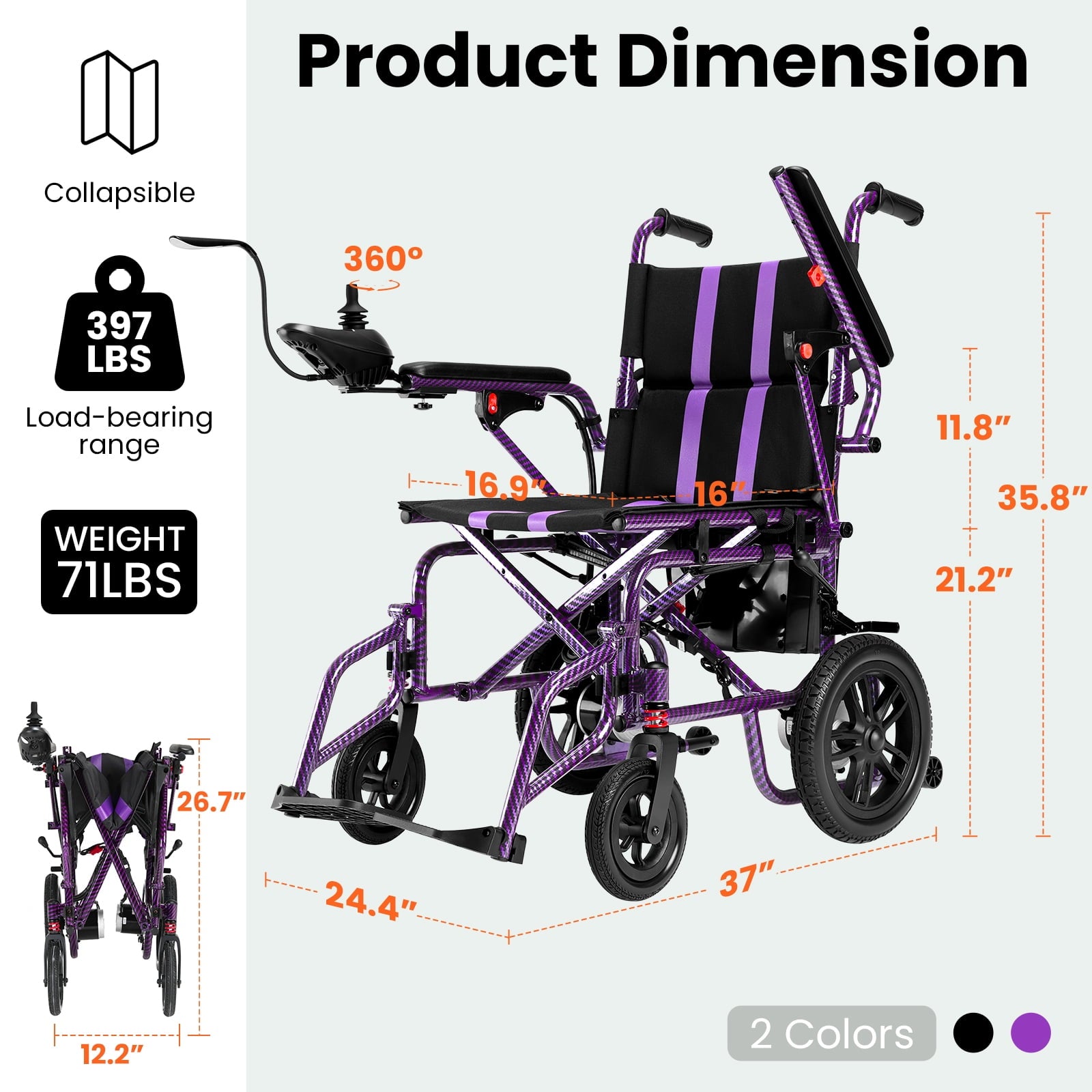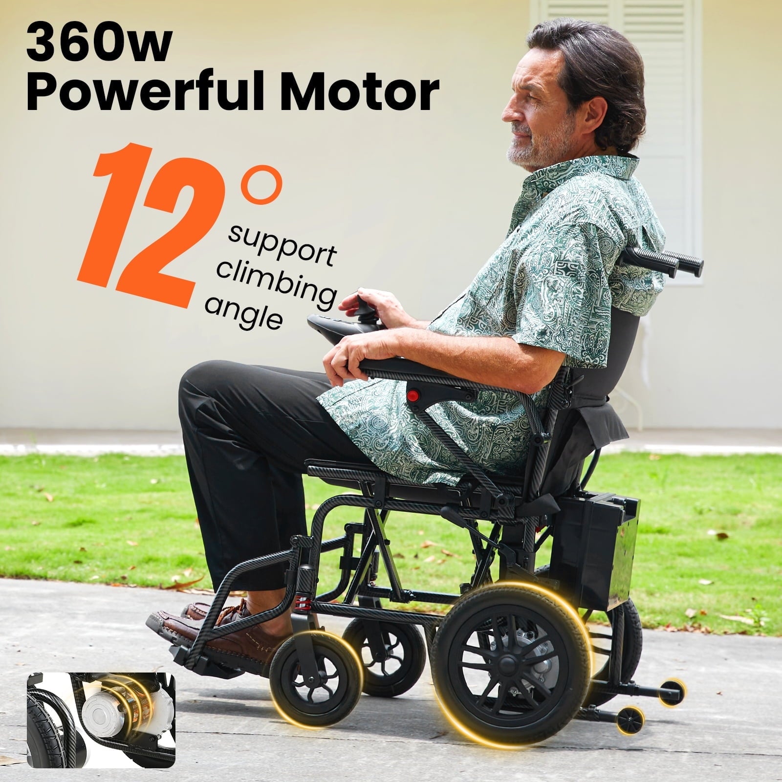 • 【Ultra-Light & Portable,Quick-Fold Design】Weighing only 70 lbs with a compact foldable design (25"L x 12"W x 26"H),this power wheelchair can be easily stored in car trunks or tight spaces.Perfect for seamless transitions between indoor,outdoor,and travel use—ideal for seniors and adventurers.