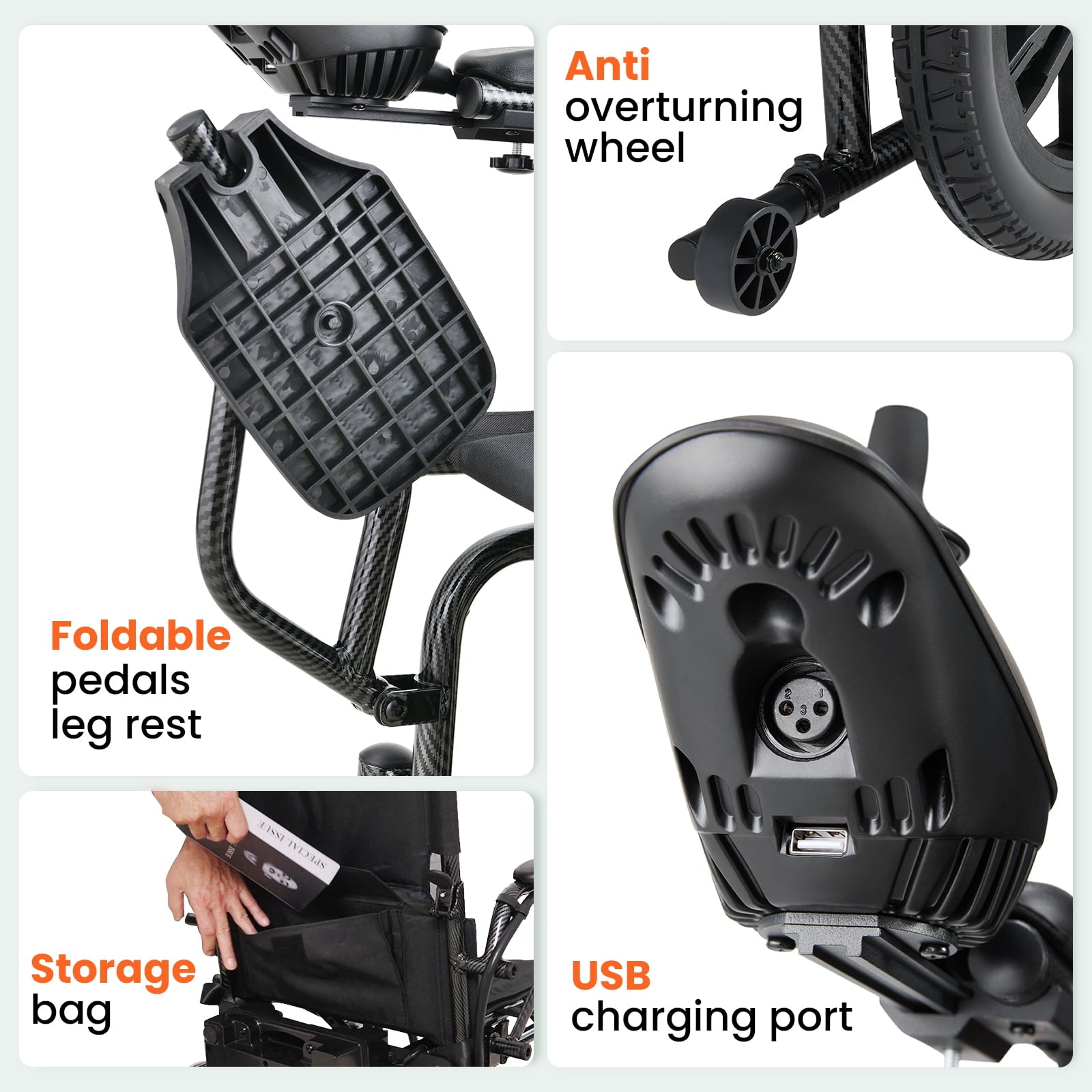• 【USB Charging Port & Detachable LED Light】This power wheelchair comes with a USB port for phone charging and includes a removable USB light to brighten your path during nighttime use.