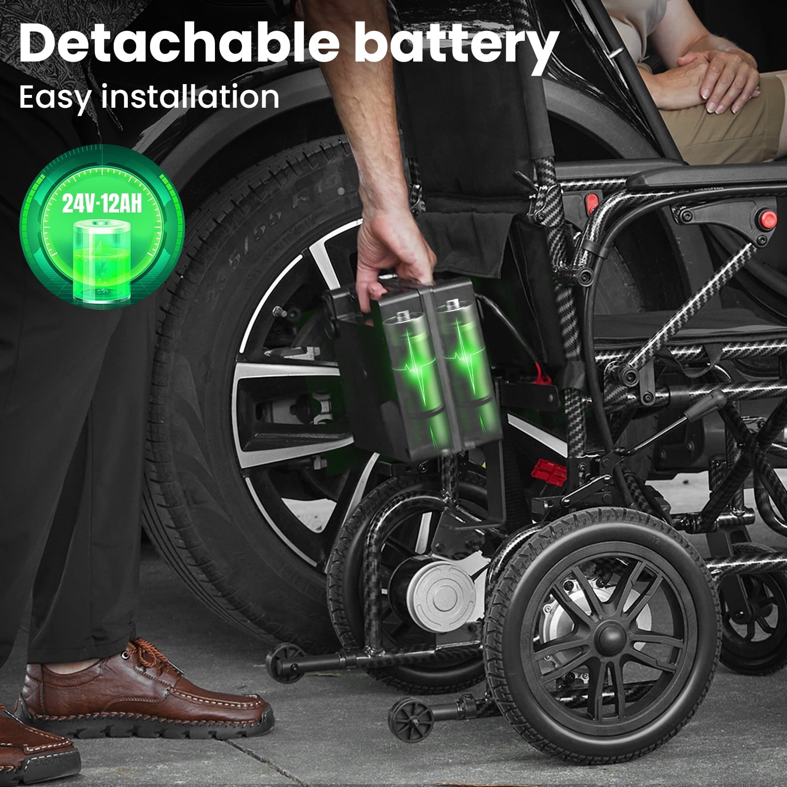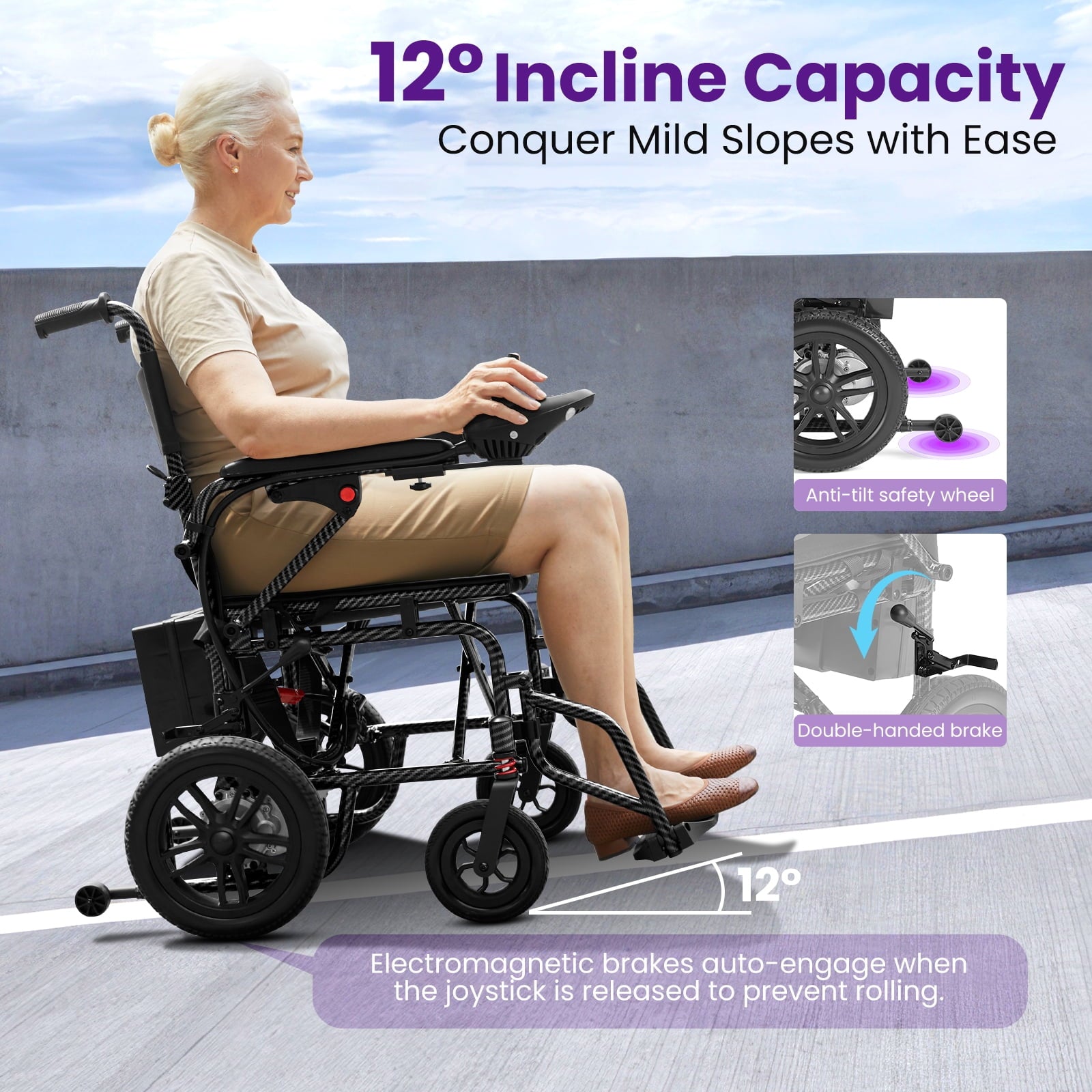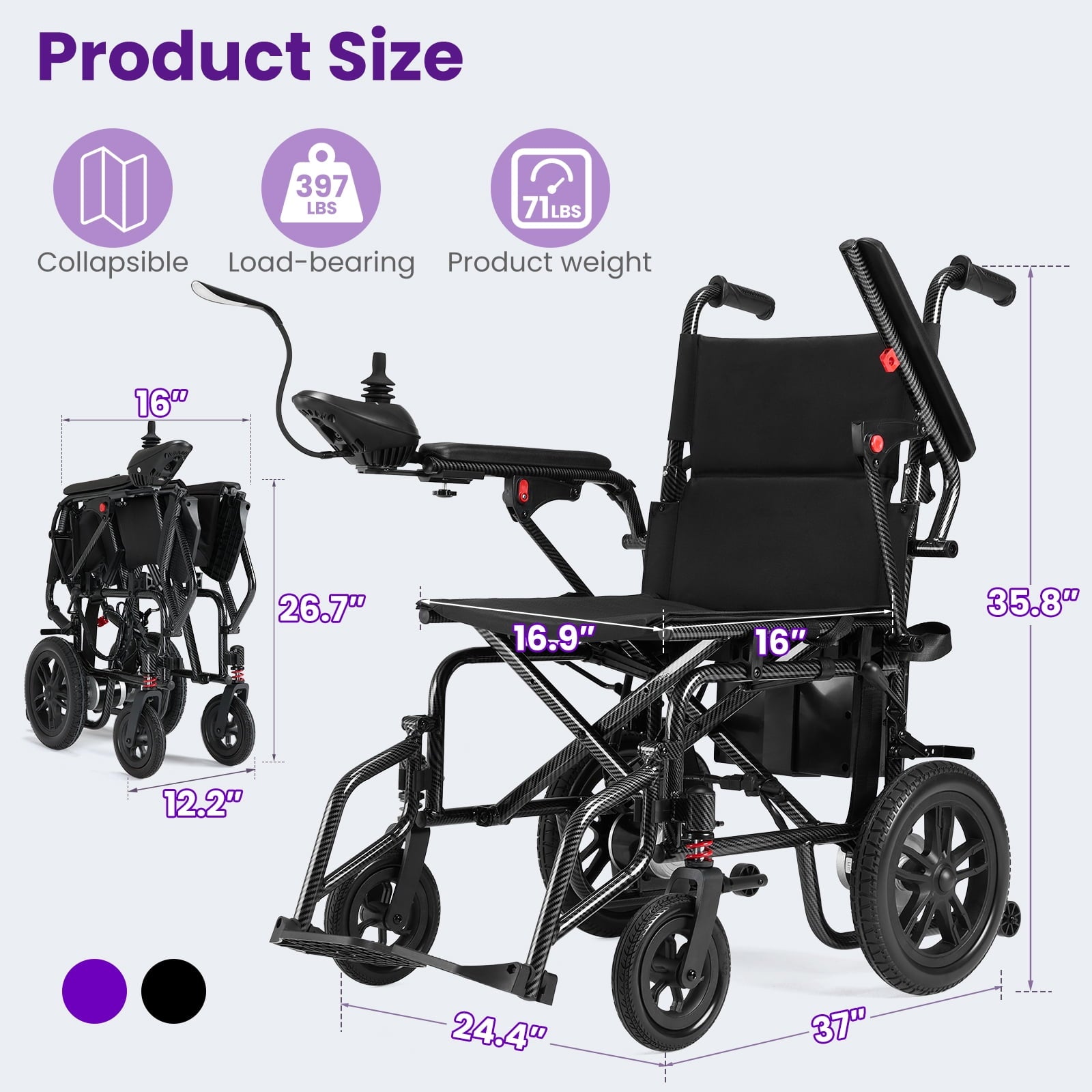 • Ultra-Light & Portable,Quick-Fold Design:Weighing only 70 lbs with a compact foldable design (25"L x 12"W x 26"H),this power wheelchair can be easily stored in car trunks or tight spaces.Perfect for seamless transitions between indoor,outdoor,and travel use—ideal for seniors and adventurers.