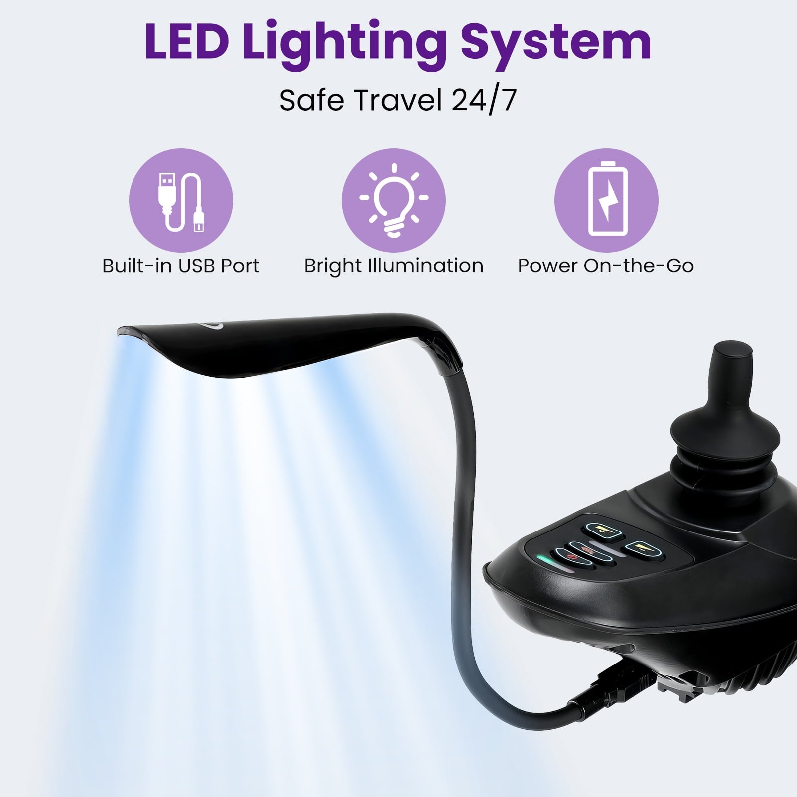 • USB Charging Port & Detachable LED Light:This power wheelchair comes with a USB port for phone charging and includes a removable USB light to brighten your path during nighttime use.