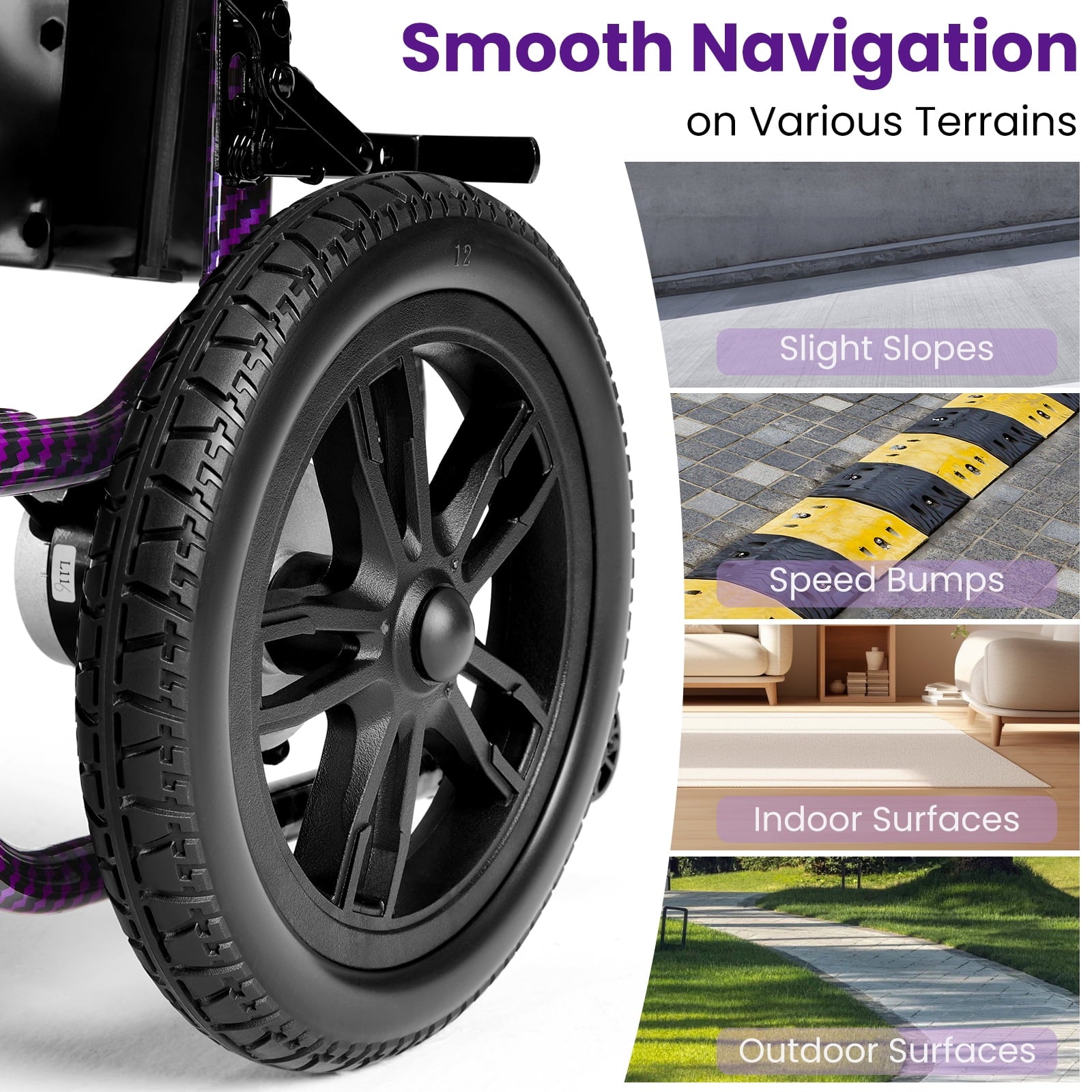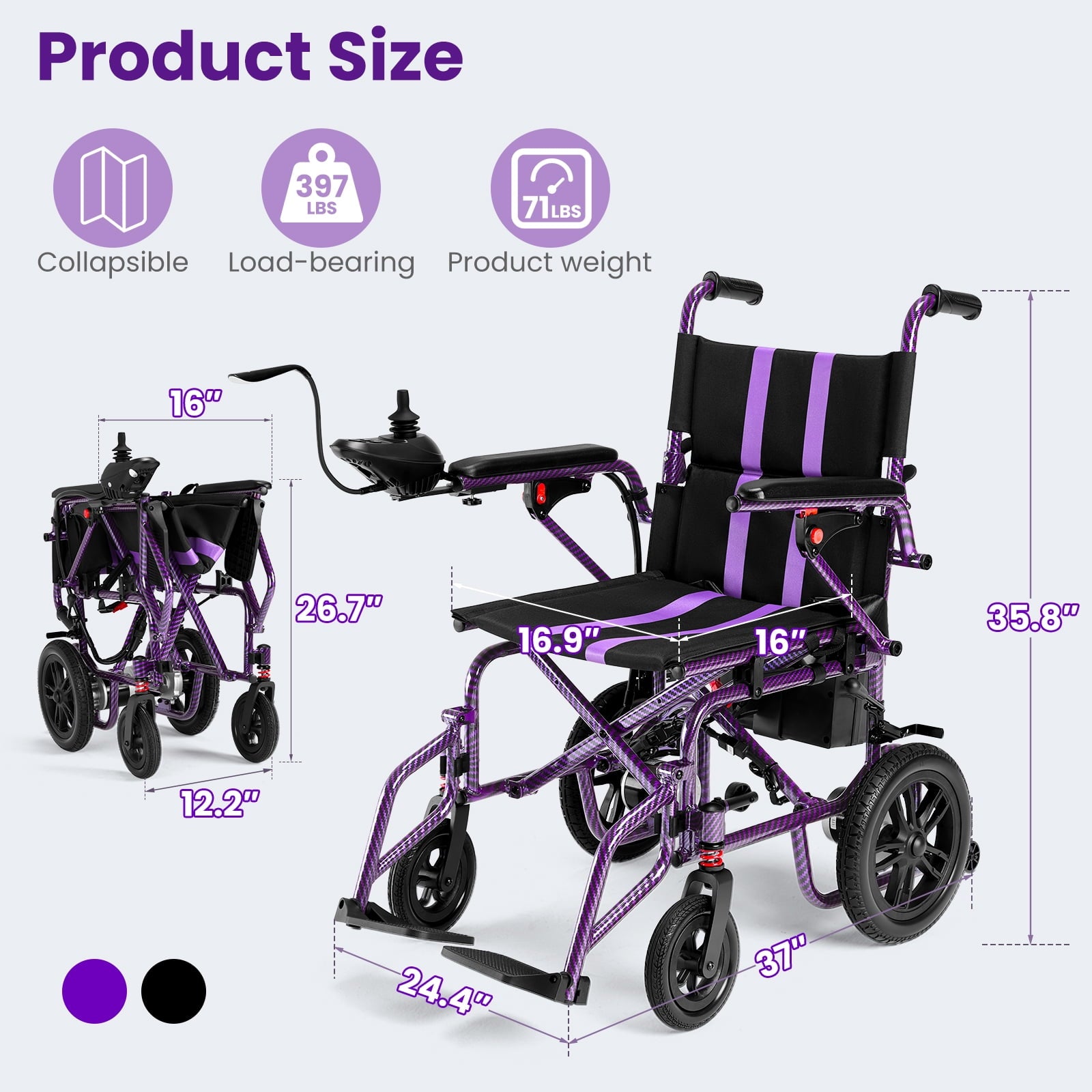 • Ultra-Light & Portable,Quick-Fold Design:Weighing only 70 lbs with a compact foldable design (25"L x 12"W x 26"H),this power wheelchair can be easily stored in car trunks or tight spaces.Perfect for seamless transitions between indoor,outdoor,and travel use—ideal for seniors and adventurers.