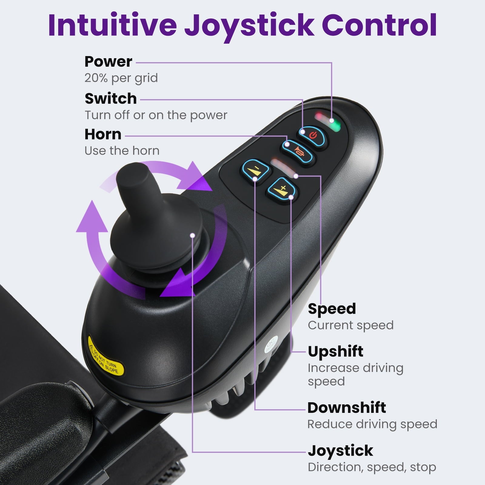 • 360°Joystick Control, All-Terrain Mobility:The responsive 360° joystick on this Electric Wheelchair ensures precise maneuvering and braking,even in tight spaces.Balancing power,efficiency,and compact size,its robust motor handles 397 lbs with ease,mastering varied terrains.