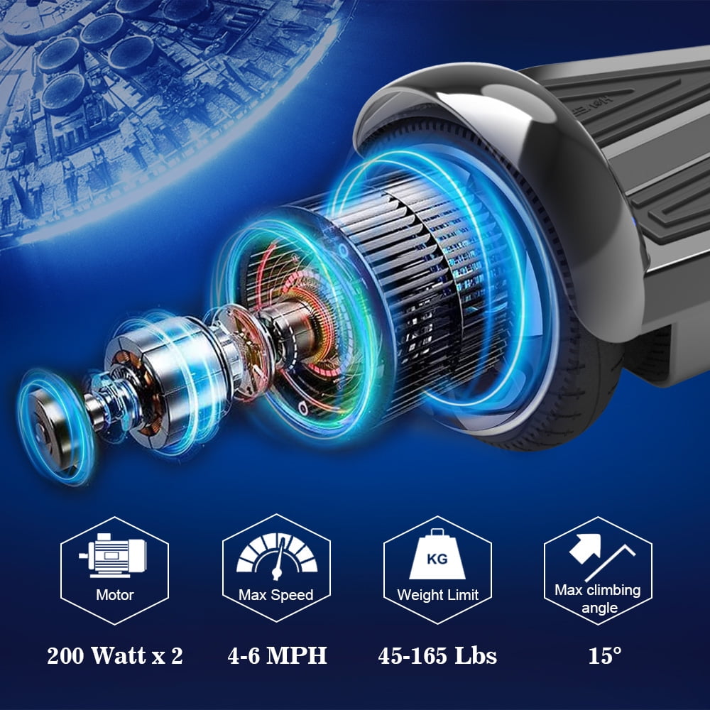 • Powerful Dual Motors | Experience a smooth,thrilling ride with two robust 200-watt motors in this Balance Scooter.Conquer gravel,sand,and rough terrain like a pro while hitting speeds of up to 9 mph!