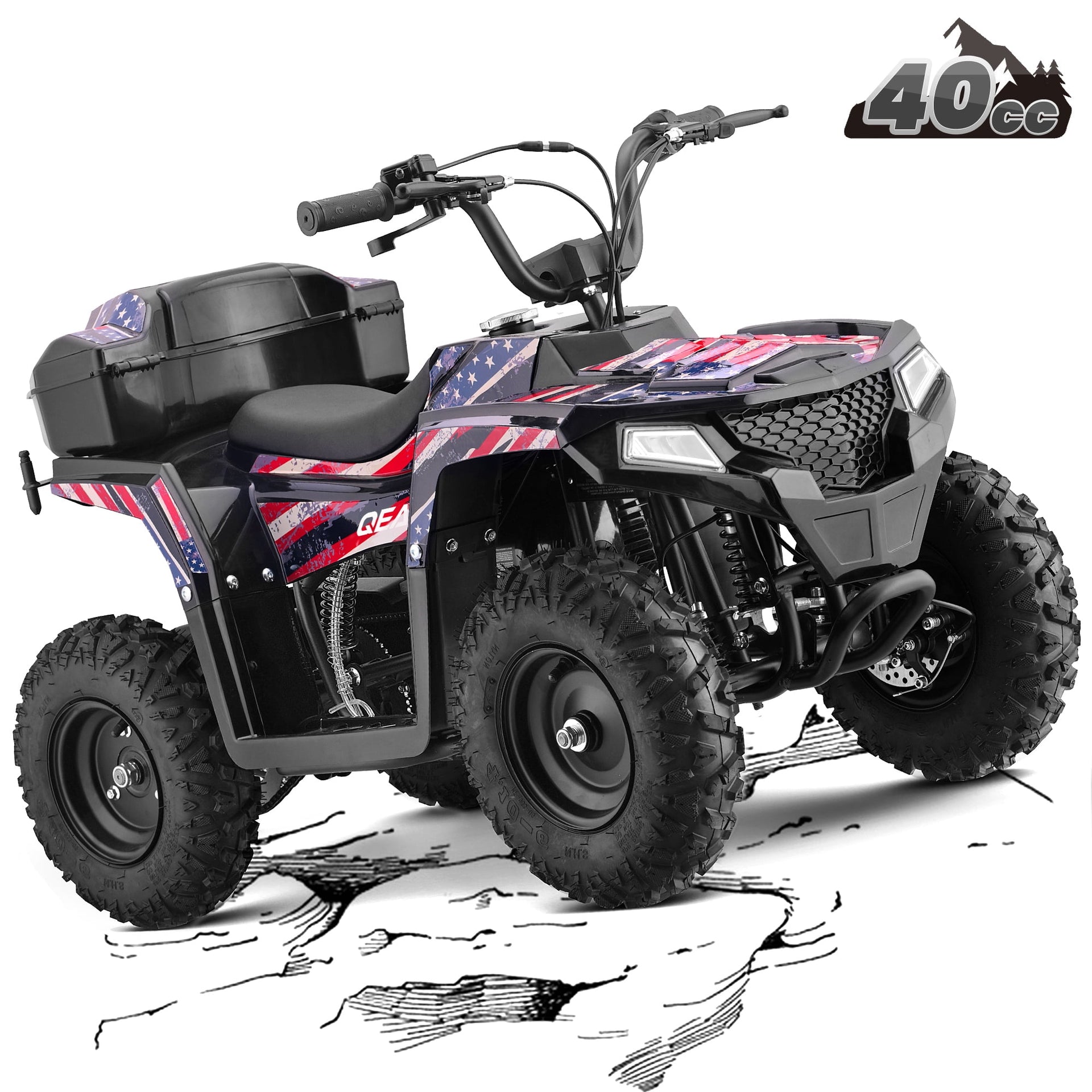 QEASET Trail Blazer puts real engine excitement in a backyard-sized package. The 40 cc 4-stroke motor feeds a chain-driven rear axle while the steel frame, front & rear shocks and knobby tires tackle grass, dirt or gravel. Parents hold the speed key: lock it at 10 mph for newcomers or release up to 15.5 mph as skills grow. One 0.32-gal tank delivers up to 45 minutes of non-stop action, and the included safety flag keeps every lap visible. Assembly is tool-light—bolt on handlebar, shocks, seat, add the provided 15W-40 oil & fuel, and ride. Single rider, 165 lb max, ages 6+. Helmet and protective gear required (not included).