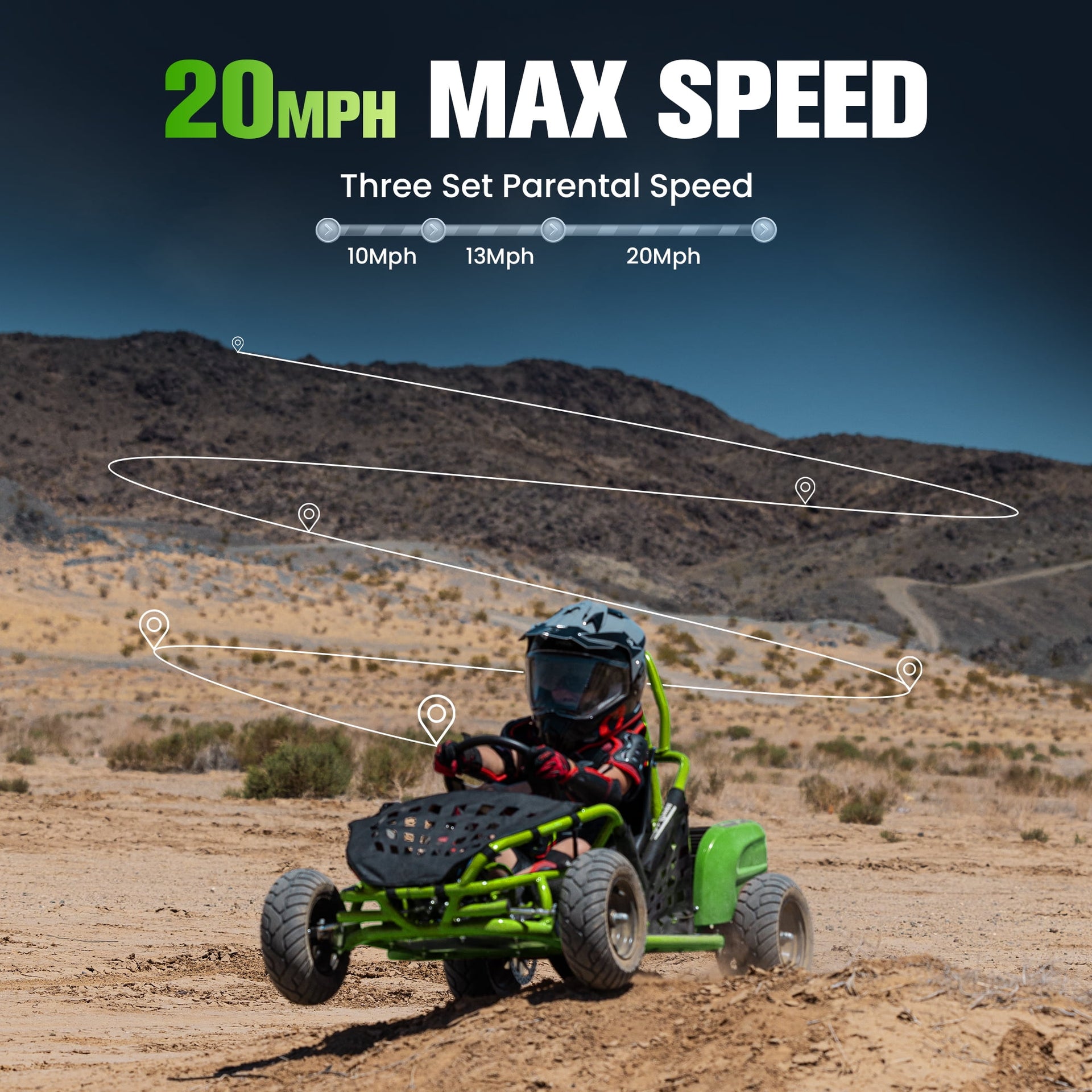 • Parental Speed Key – Choose 7, 15 or 20 mph top speed; keyed lockout keeps beginners in control and parents at ease.