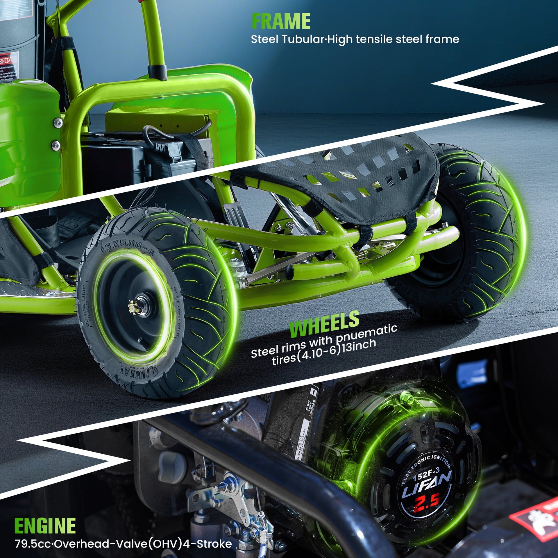 • Race-Ready Safety – High-tensile steel frame, upper roll-bar, side nerf bars, full tread-plate floor, 4-point seat belt and padded steering wheel.