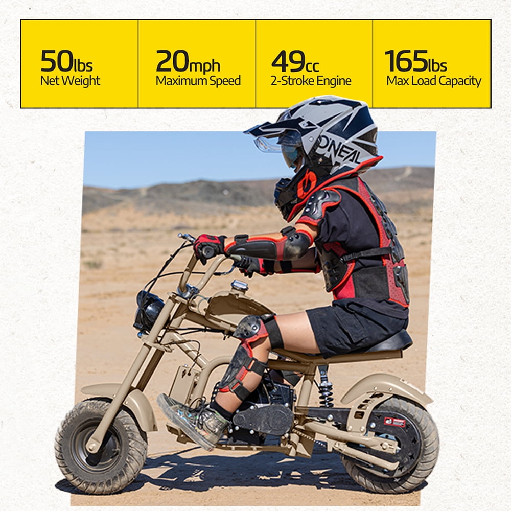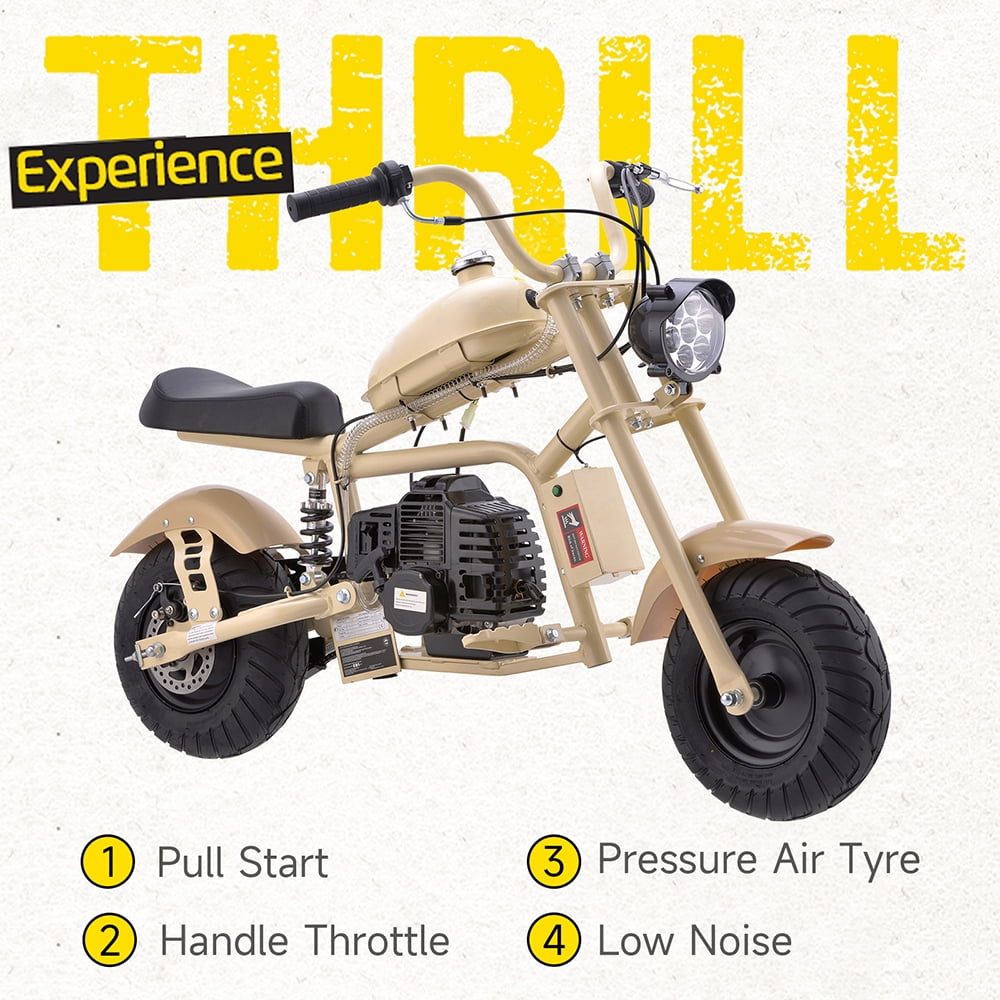 • Mini dirt bike provides easy pull start operations, and kids can start the 49cc dirt bike up easily. Low-pressure pneumatic tires provide soft & smooth ride.