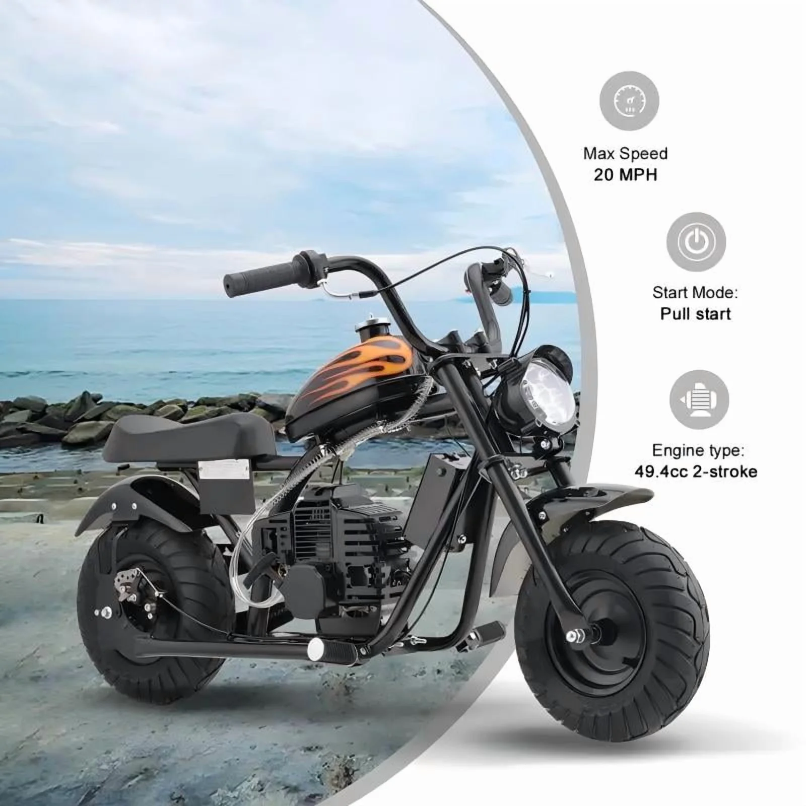 Discover the thrill of off-road adventure with this 49cc Dirt Bike. Featuring a 2-stroke engine, disc brakes, and an LED headlight, this mini bike is perfect for kids and teens. With a max load of 160 lbs, it's built to handle the rigors of outdoor riding. The easy-to-use pull start and variable twist-grip throttle provide smooth control, while the adjustable handlebars and padded seat ensure a comfortable ride. Powered by regular gas or #91 fuel, this EPA-approved dirt bike is a great choice for those seeking an exciting and safe outdoor experience.