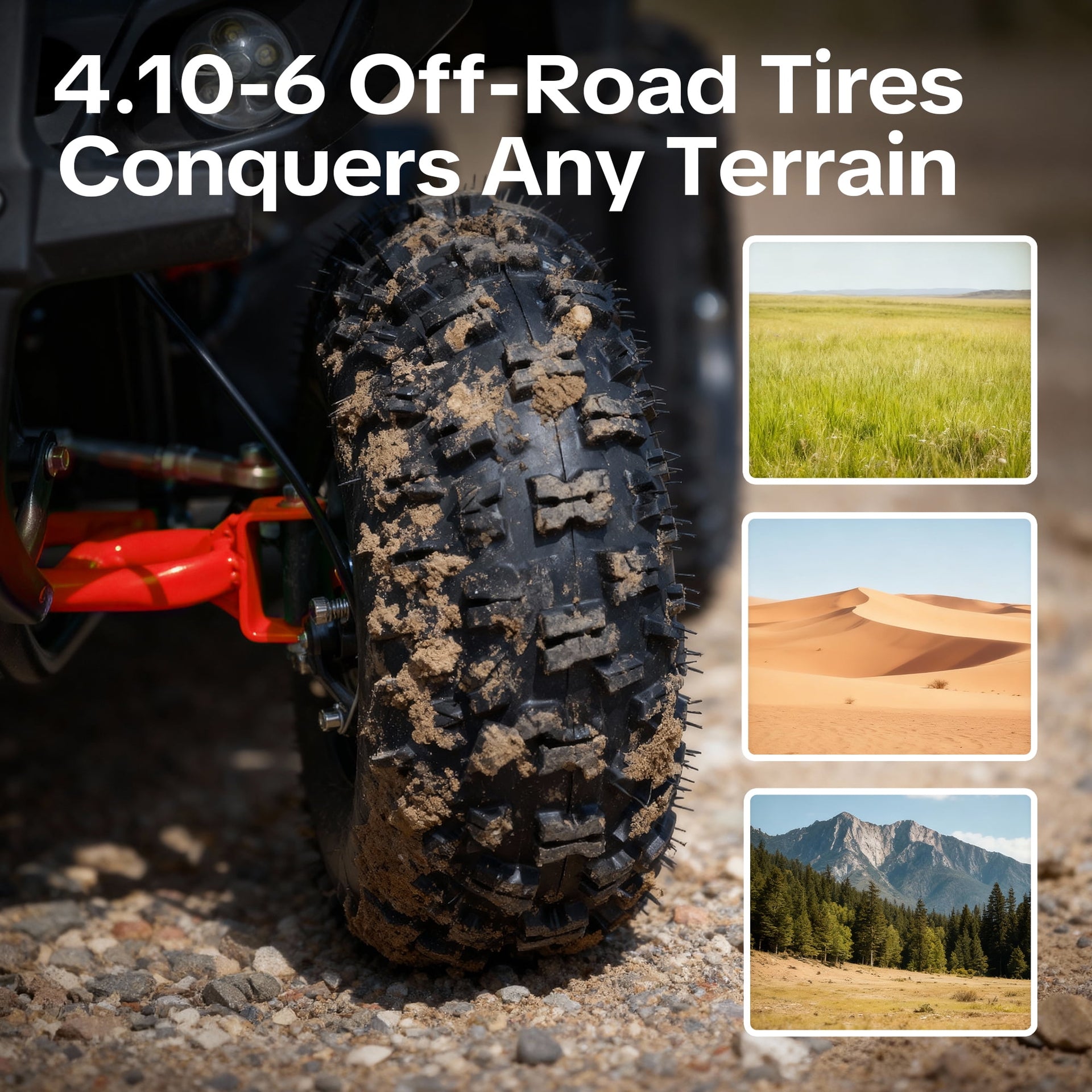 • Trail-ready features: chain drive, rear disc brake, full suspension, and knobby 4.10-6 tubeless tires grip grass, gravel, or dirt.