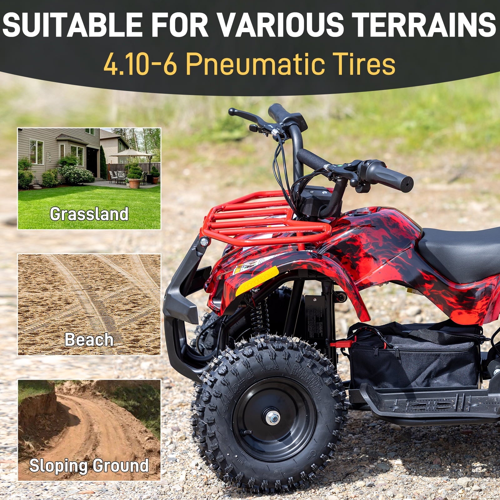 QEASET brings off-road excitement straight to your driveway with the 500 W Battery Ride-On 4-Wheeler. Powered by a 36 V 12 Ah battery and a quiet 500 W motor, this machine cruises up to 15 miles at 10 mph or 15 mph—just flip the speed switch to match the terrain. Pneumatic 4.10-6 knobby tires, full suspension, and a reliable rear disc brake smooth out bumps and deliver confident stops on grass, gravel, or dirt. Four vibrant colorways—Red Flame, Classic Red, Green, or Orange—let every rider pick a signature look. Built tough to carry up to 65 kg yet compact enough to store at 41" L × 26" W × 23" H, the QEASET arrives 90 % pre-assembled at 123 lb shipping weight. Bolt on the wheels, charge for 6–8 hours, and turn any open space into your personal adventure zone.