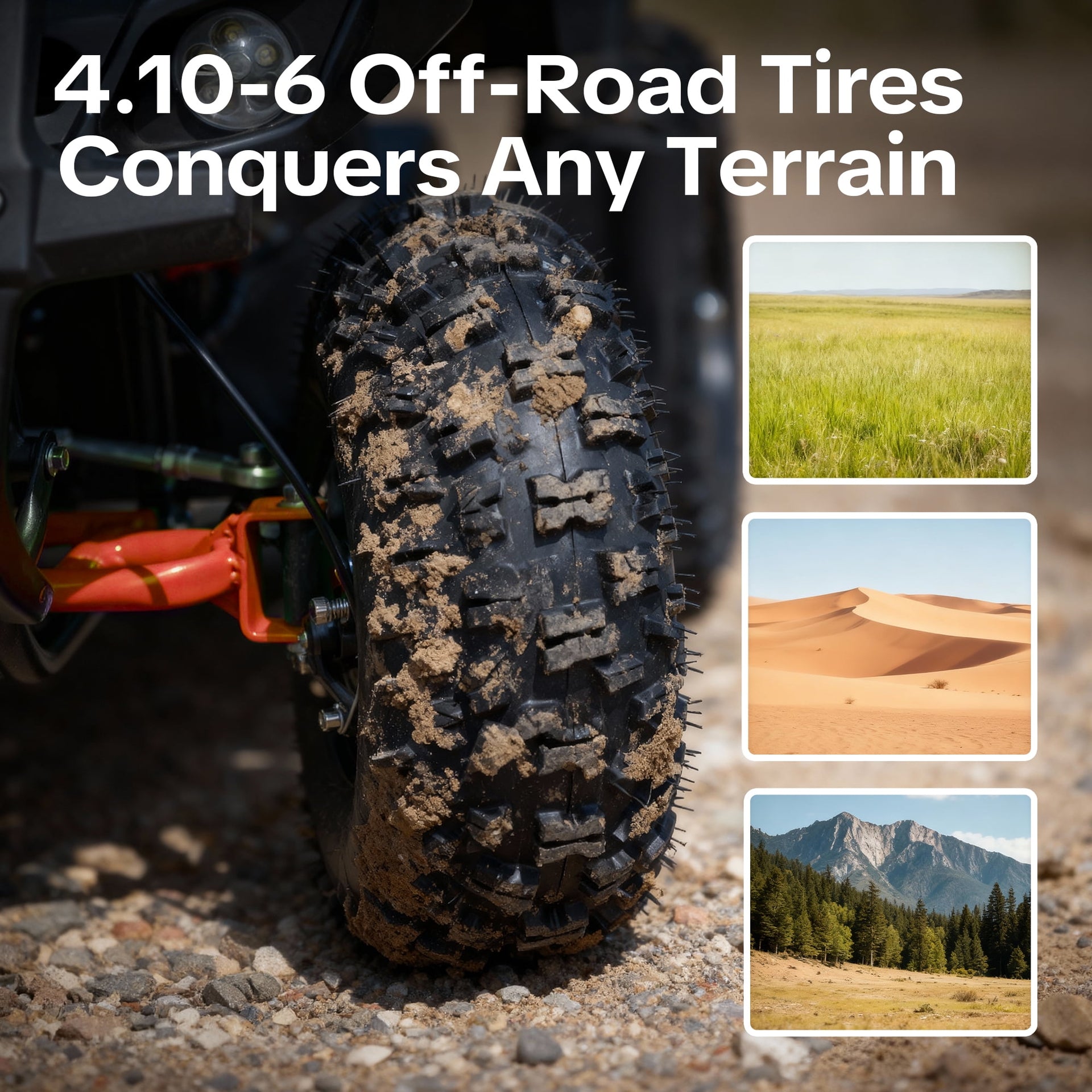 • Trail-ready features: chain drive, rear disc brake, full suspension, and knobby 4.10-6 tubeless tires grip grass, gravel, or dirt.