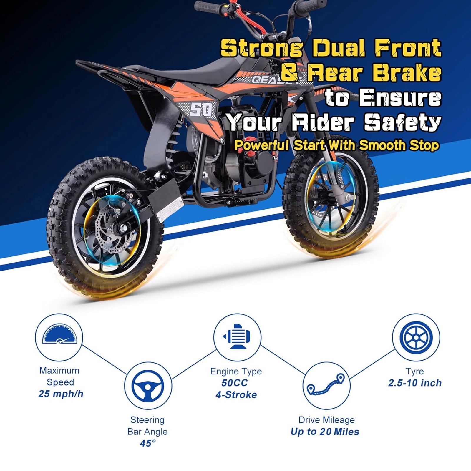 QEASET Gas Dirt Bike for Adults & Teens, 49CC 4-Stroke Gas Powered  Mini Bike, Max Speed 25mph, Age13+(Orange)