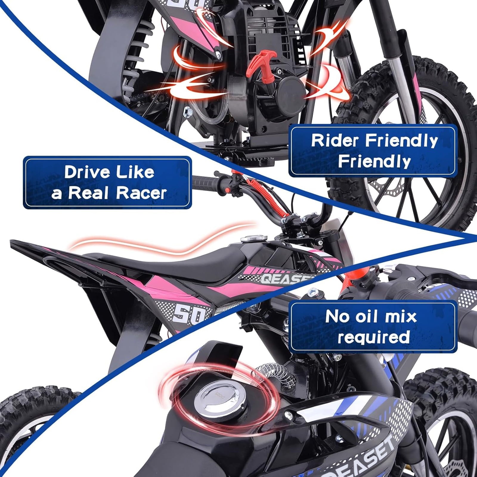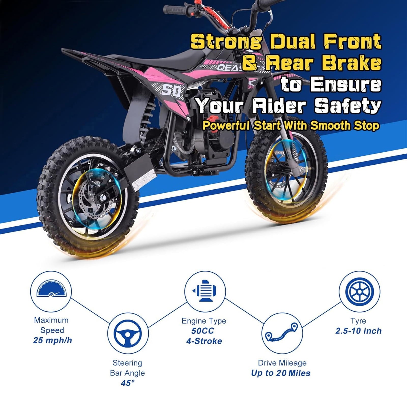 Features a pull start engine and a variable twist-grip throttle for easy control and an adrenaline-filled ride.