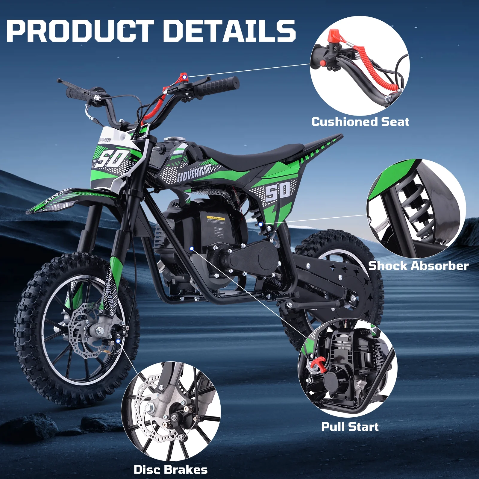 QEASET Gas Mini Dirt Bike, 39.4 CC 4-Stroke Dirt Bike, Rear Shock Absorber, Metal Frame, Disc Brakes, Max Load 165Lbs, Up to 20Mph, No Oil Mix Require, Green