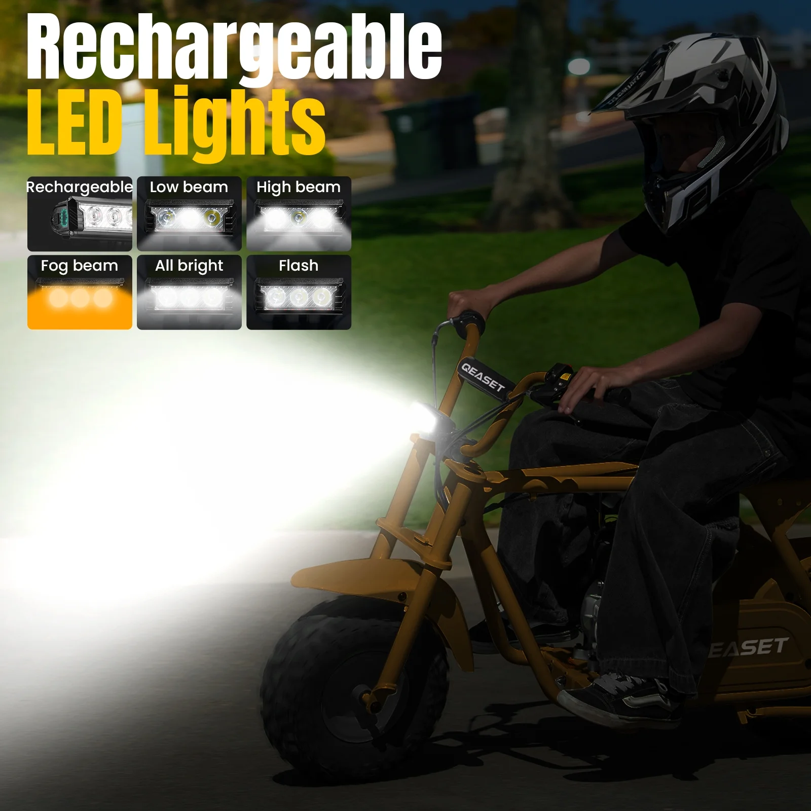 Get off the couch and onto the trail with the QEASET Mini Dirt Bike. Arriving 85 % pre-assembled, most riders are ready to rip in under 20 minutes. The torque-rich 4-stroke engine propels you to 30 km/h (18.6 mph) and powers up 15° hills without hesitation. Aggressive 145/70-6 front & 145/70-5 rear knobby tires wrapped around lightweight alloy rims give you sure-footed grip on dirt, sand, or gravel. A low 24.8-inch seat height and rear disc brake deliver confidence-inspiring control for new and seasoned riders alike. Whether you’re carving backyard tracks, patrolling the farm, or camping off-grid, QEASET is the affordable, low-maintenance ticket to big-bike thrills in a compact package.