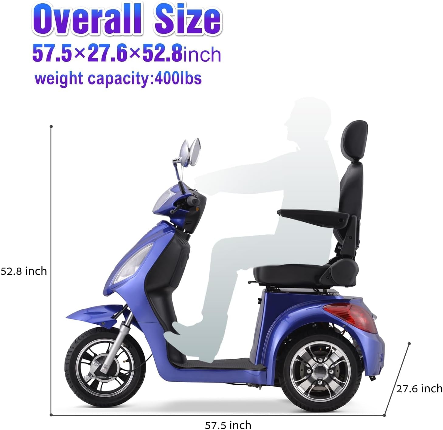 Super Large Electric 3 Wheel Mobility Scooters, Heavy Duty 800W Wheelchair Device, 500 LBS Capacity for Seniors & Adults, Speed Adjust, Remote Key, Receive Ready to Ride.(Blue)
