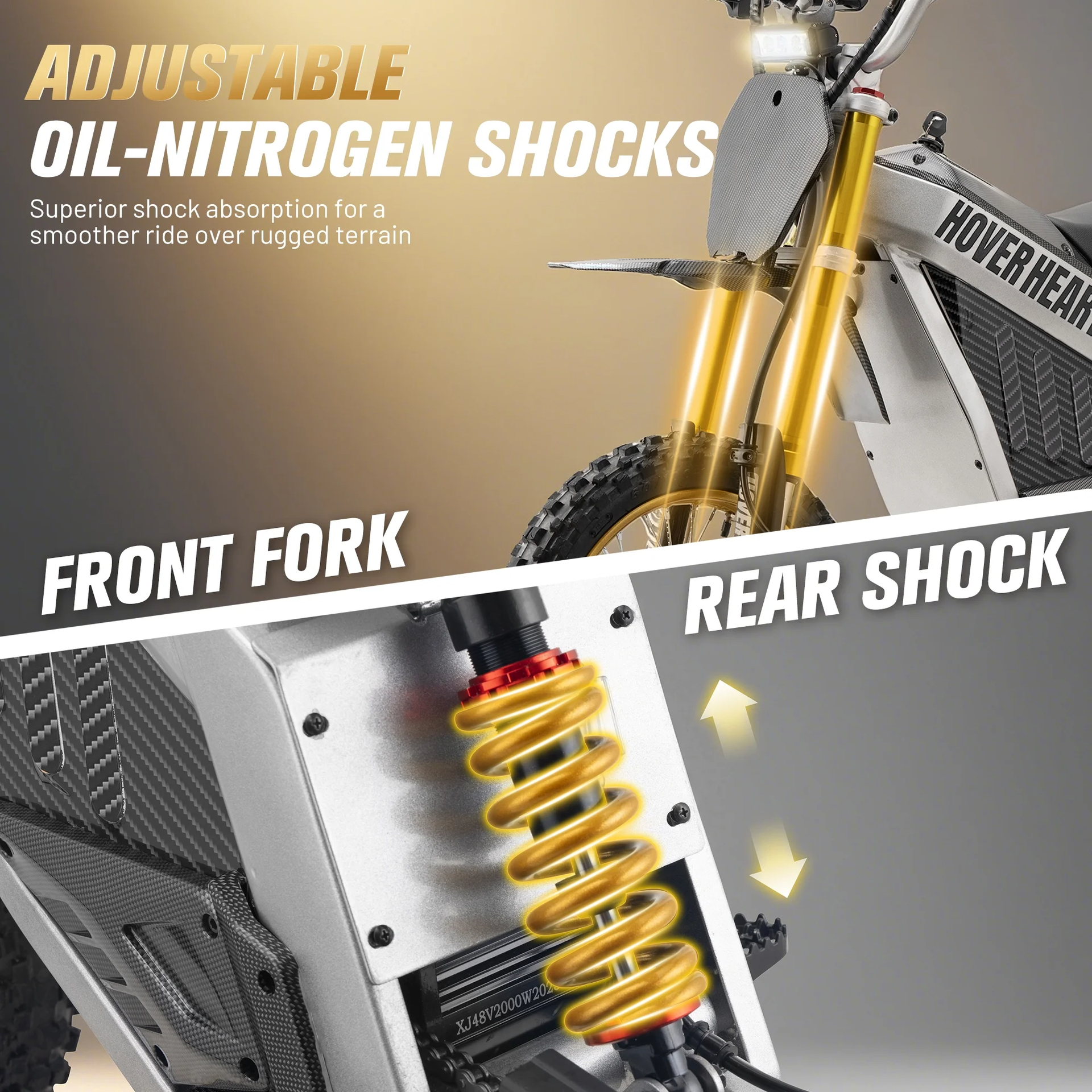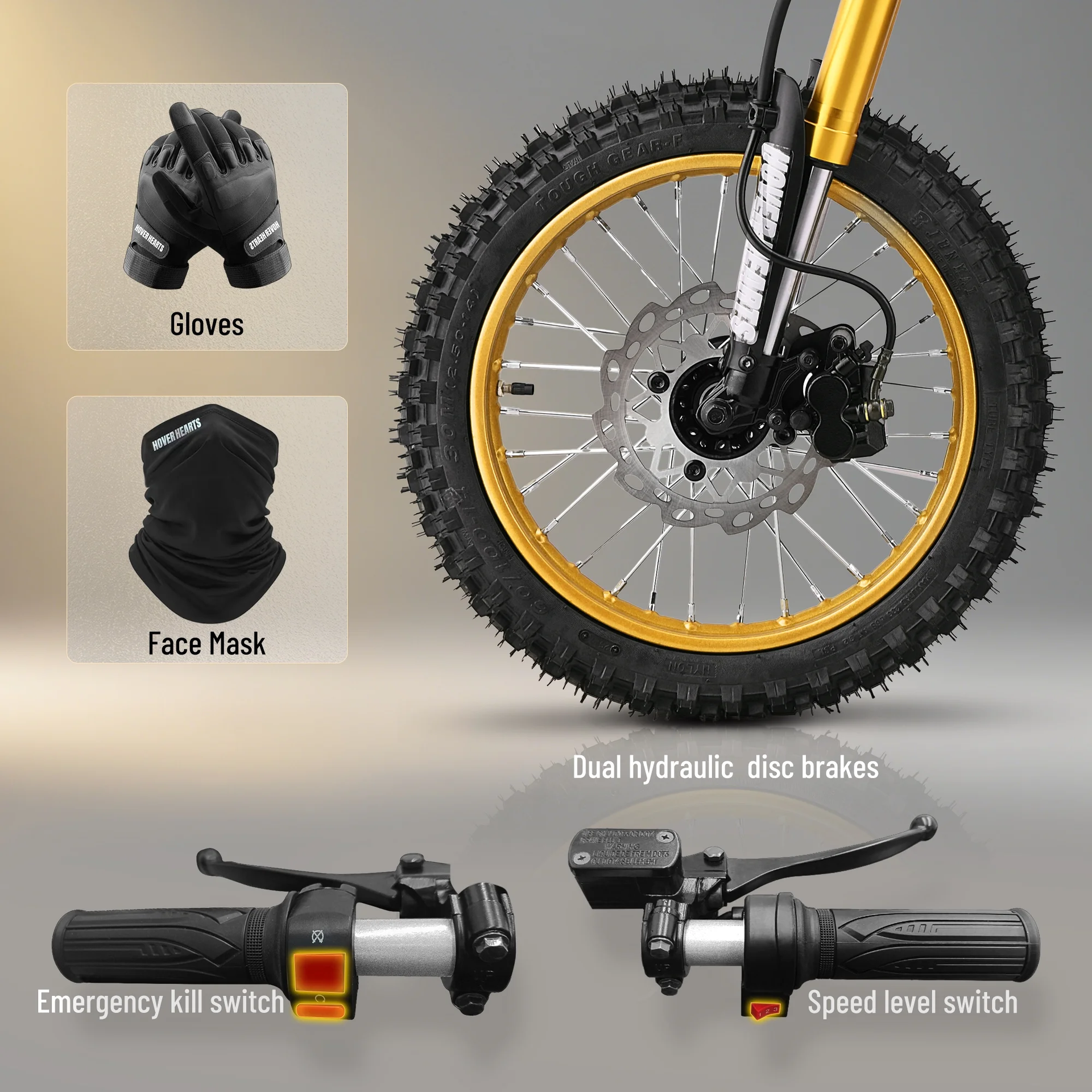 Get straight to the dirt with the DZ009 Teen Electric Dirt Bike. A non-removable, UL-listed 48 V 30 Ah LiFePO4 battery powers a 2000 W mid-drive motor that rockets riders to 34 mph (55 km/h) while offering 25 miles (40 km) of quiet range. The chromoly frame weighs only 132 lb (60 kg) yet carries up to 220 lb (100 kg). Front and rear hydraulic suspension with 270 mm ground clearance soaks up rocks, jumps and ruts; dual hydraulic disc brakes with regen add track-level stopping power. Oversized 14-inch front and 12-inch rear knobby tires bite into loose terrain, and a two-speed auto-shift keeps novices and pros equally happy. Every bike ships 90 % pre-assembled from our California warehouse—most owners bolt on the handlebars and hit the trail in under 15 minutes. Enjoy 30-day free returns, 90-day parts coverage and lifetime U.S.-based tech support. Bring motocross excitement to campgrounds, farms or private tracks without gas, noise or fuss.