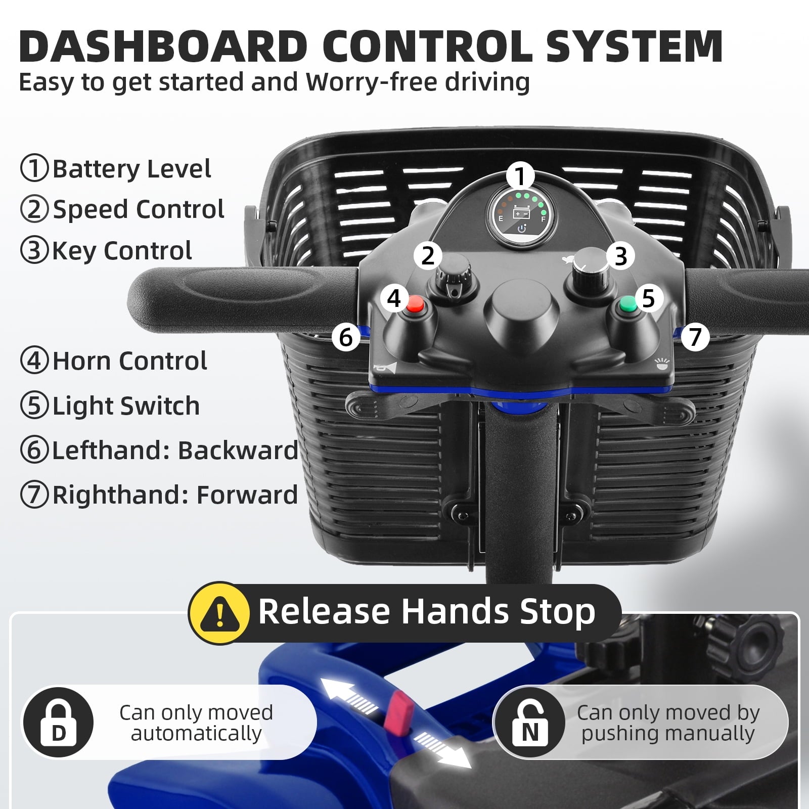 • 【Smart Control Hub, Easy Operation】The multi-functional panel includes a battery display,speed knob,headlight,horn,and alarm buttons—making this foldable mobility scooter highly intuitive.