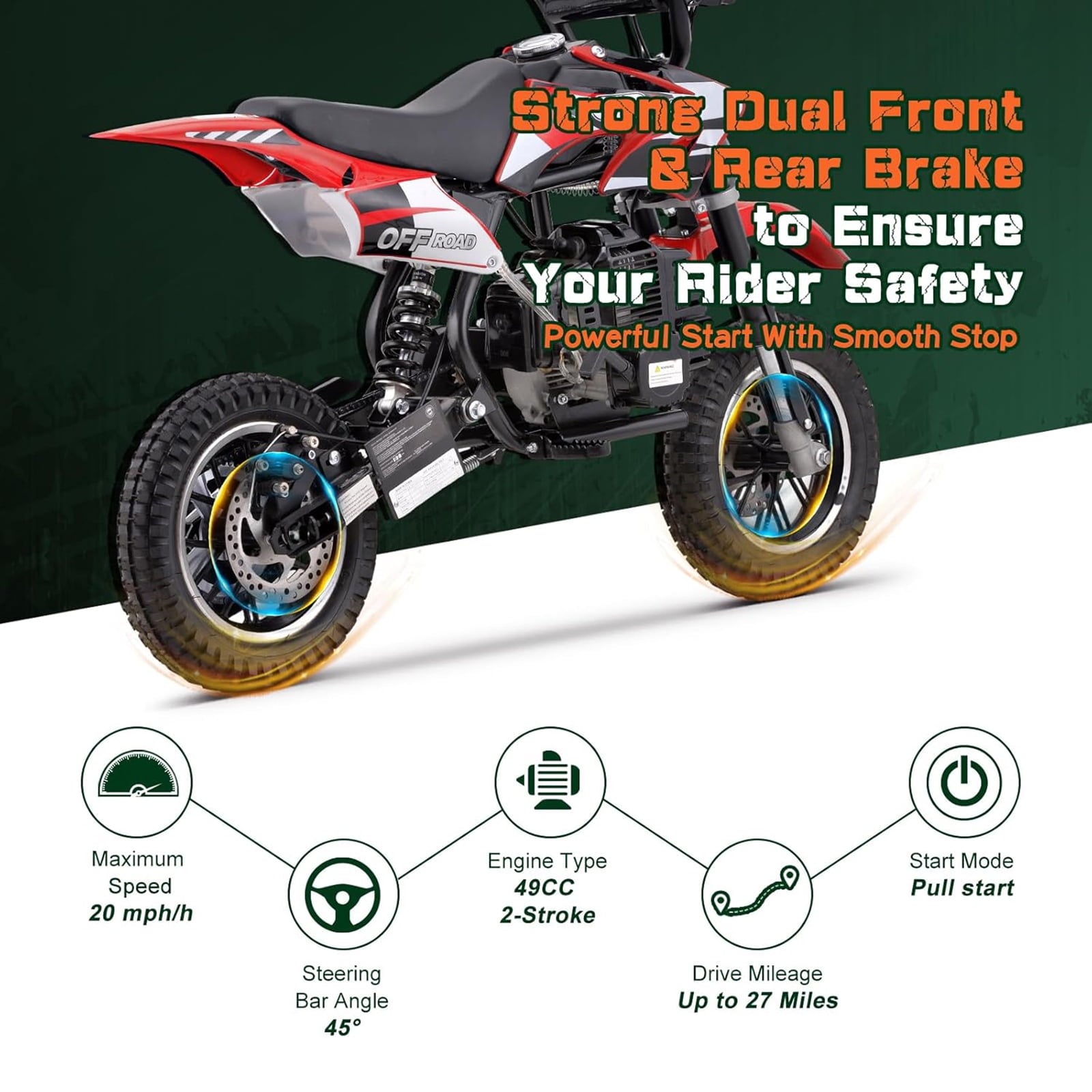WAWA 49CC Dirt Bike, Mini Bike 2-Stroke Gas Powered off Road with Max Speed 20MPH, Pull Start