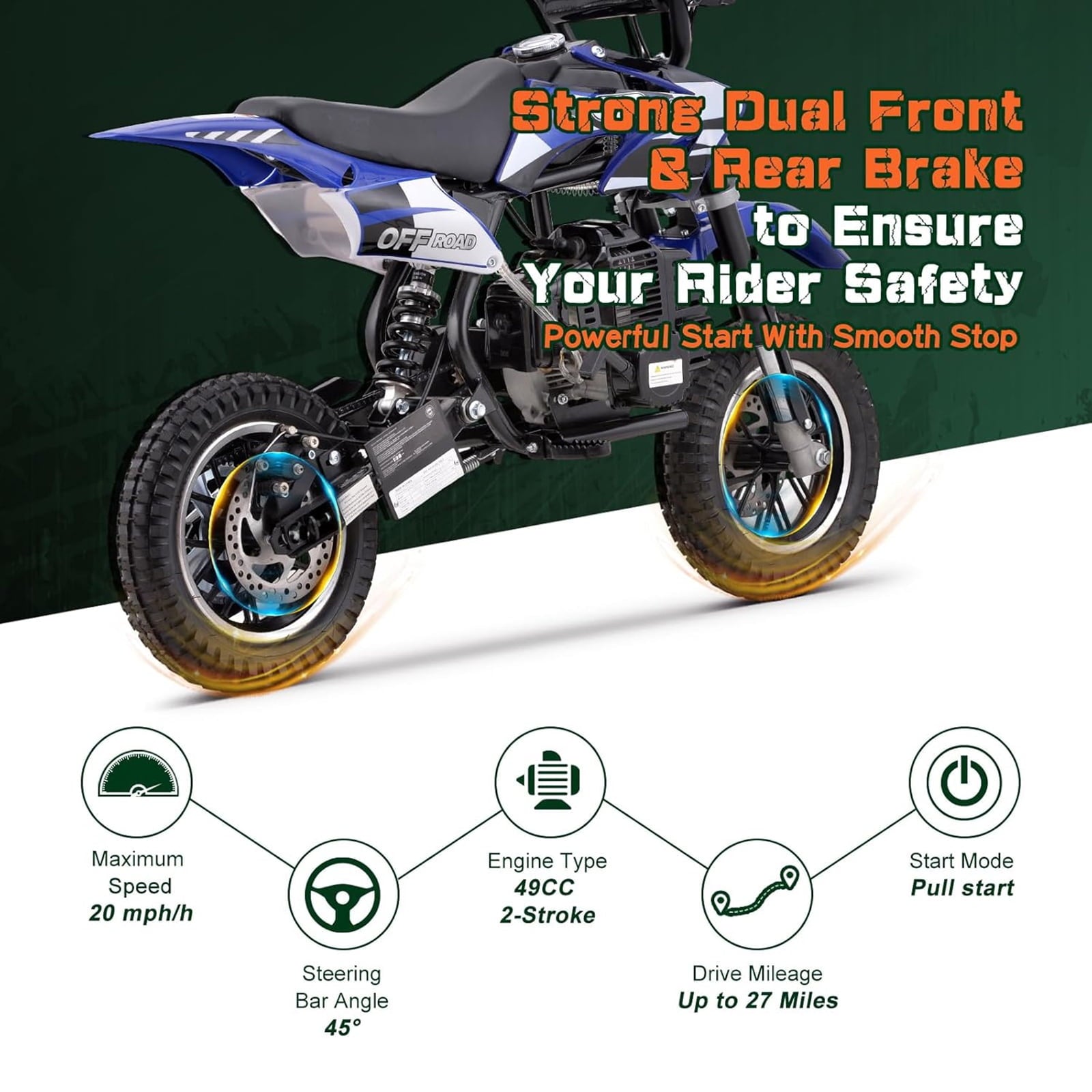2. Easy to operate: WAWA 49CC dirt bike equipped with a pull start and handle throttle, User can easily start the off-road vehicle.