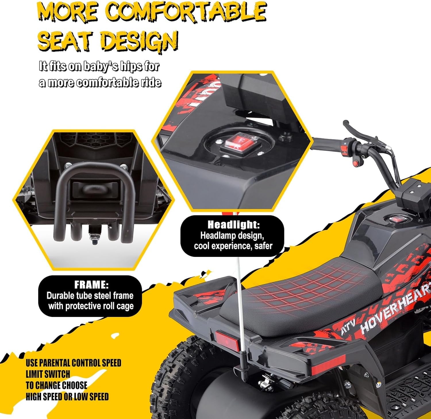 1. Features: Unique outlook, Attractive Sticker, twist-grip throttle control, disc brakes, front Led head light, suspensions, soft rubber grips, extra-large frame. 2. Powerful 500 W Motor: WAWA electric kids' ATV is equipped with a potent 500W motor that delivers power, performance and reliability 3. Long-Lasting ATV: Spend more time exploring and less time charging. With a 36V lithium-ion battery, the 4-wheeler offers an extended range of 8-10 miles per charge. 4. Dual-Speed Settings: Featuring parental speed controls to set up to 15 MPH (high setting) and 10MPH (low setting). Parents take Speed control key, they can focus on kids’ safety. 5. Durable and Comfortable: WAWA electric ATV boasts a sturdy build and provides a max 143 lbs. load, ensuring it can withstand regular use and last for years. Dual suspension and beefy pneumatic tubeless all-terrain tires provide a comfortable riding experience.